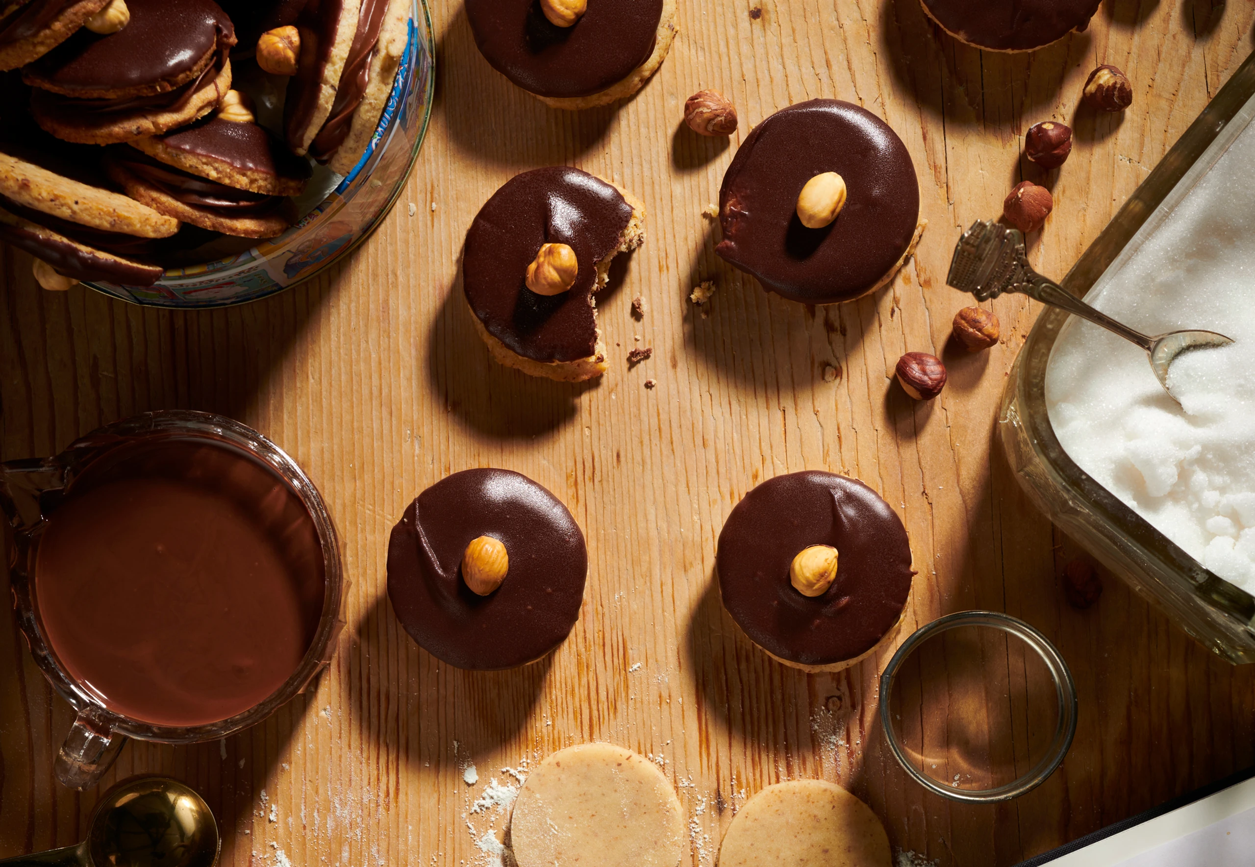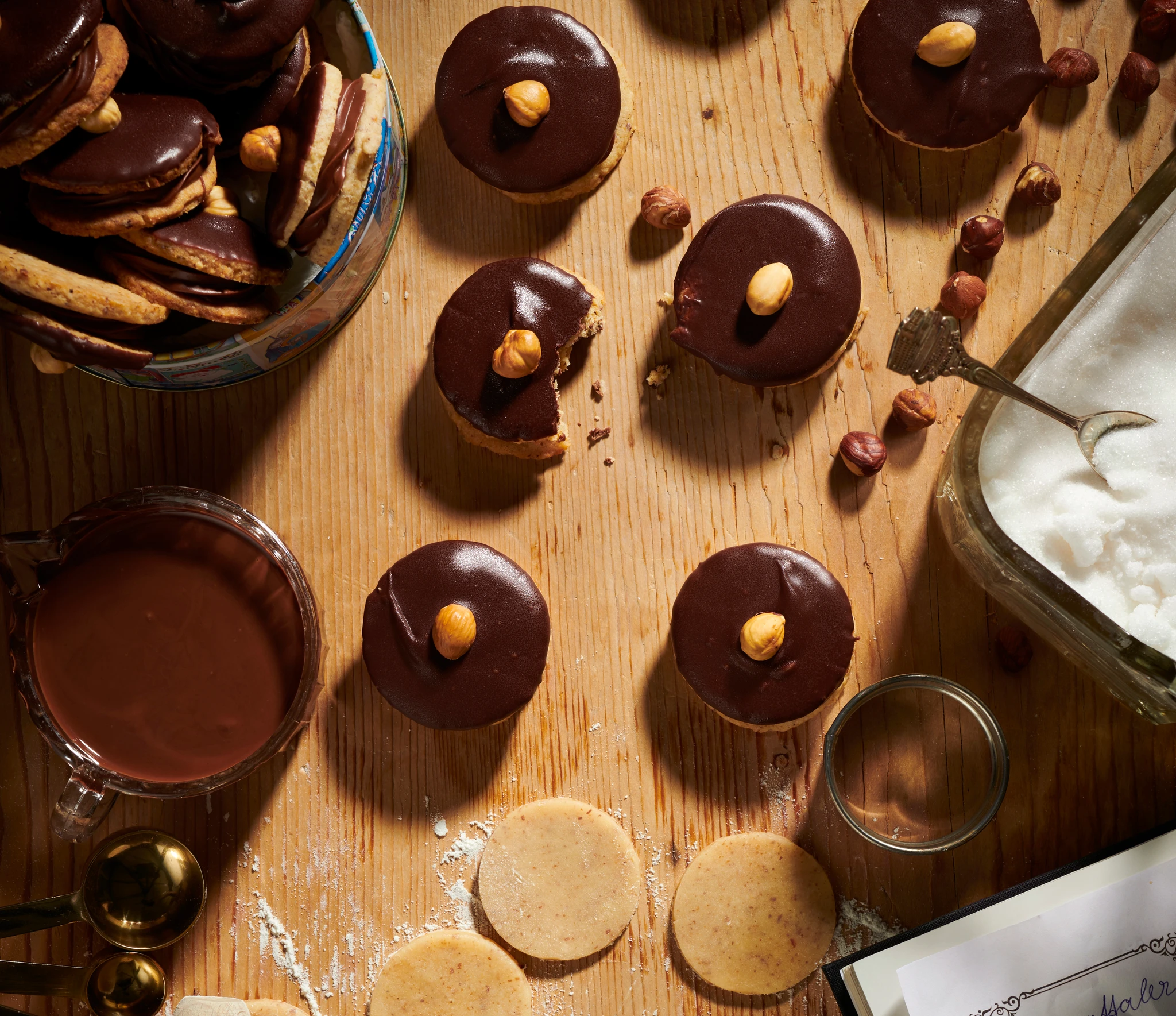 Für die Glasur Kuvertüre und Kokosfett über einem Wasserbad schmelzen. Kekse eintunken und auf Backpapier legen. Je eine Haselnuss darauf setzen.