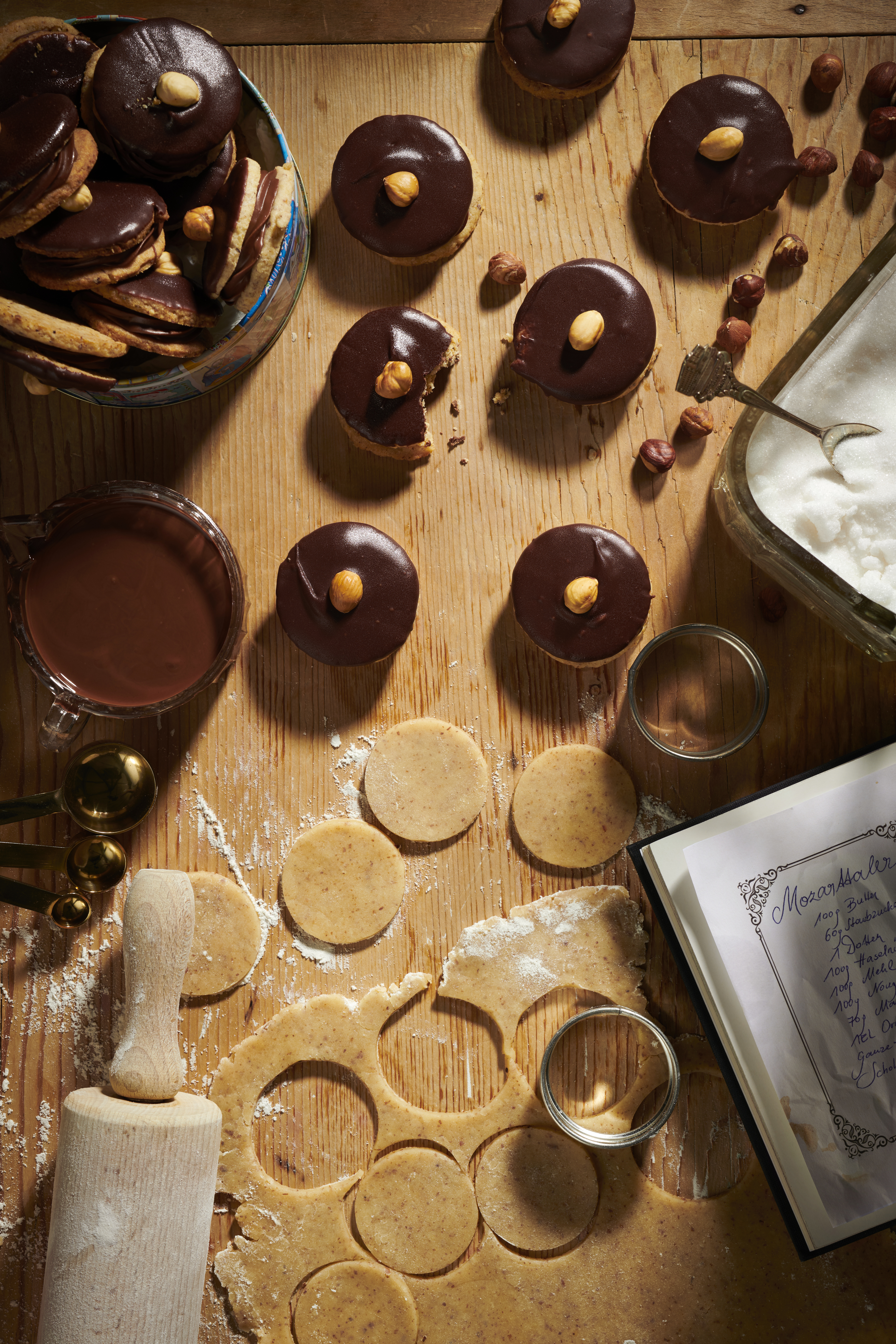 Rohr auf 180°C vorheizen. 2 Backbleche mit Backpapier belegen. Teig auf einer bemehlten Arbeitsfläche ausrollen und Scheiben (Ø 5 cm) ausstechen. Kekse auf die Bleche legen und nacheinander im Rohr (mittlere Schiene) ca. 10 Minuten backen. Herausnehmen und auskühlen lassen.
