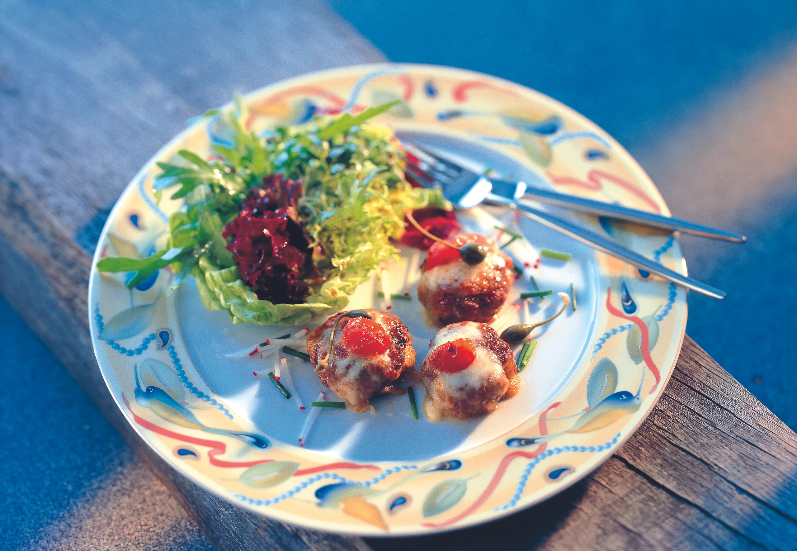 Für die Garnitur Mozzarella trockentupfen und in 12 dünne Scheiben abschneiden. Übrigen Mozzarella in 1 cm große Stücke schneiden und unter das Faschierte rühren. Cocktailparadeiser halbieren.