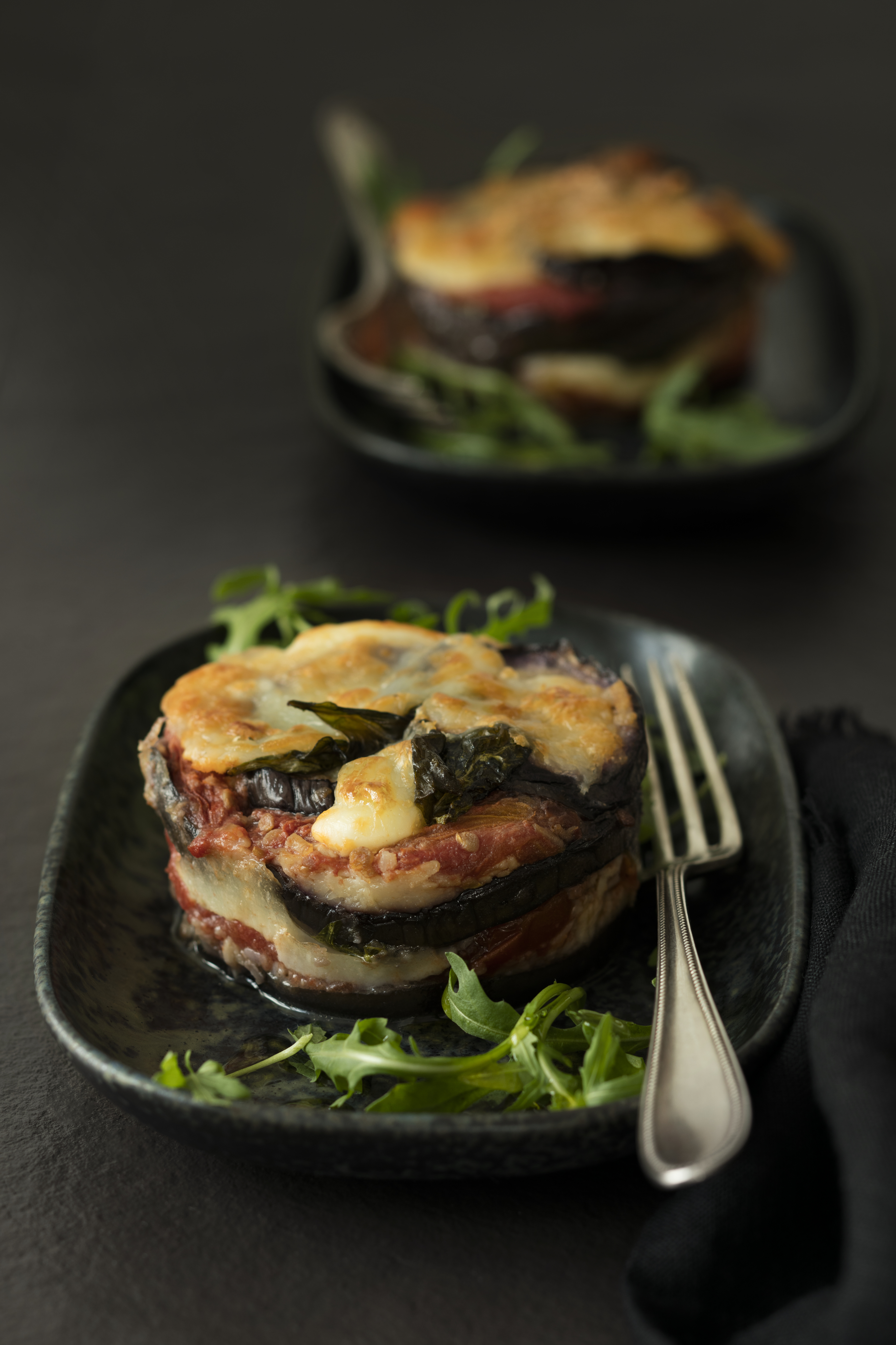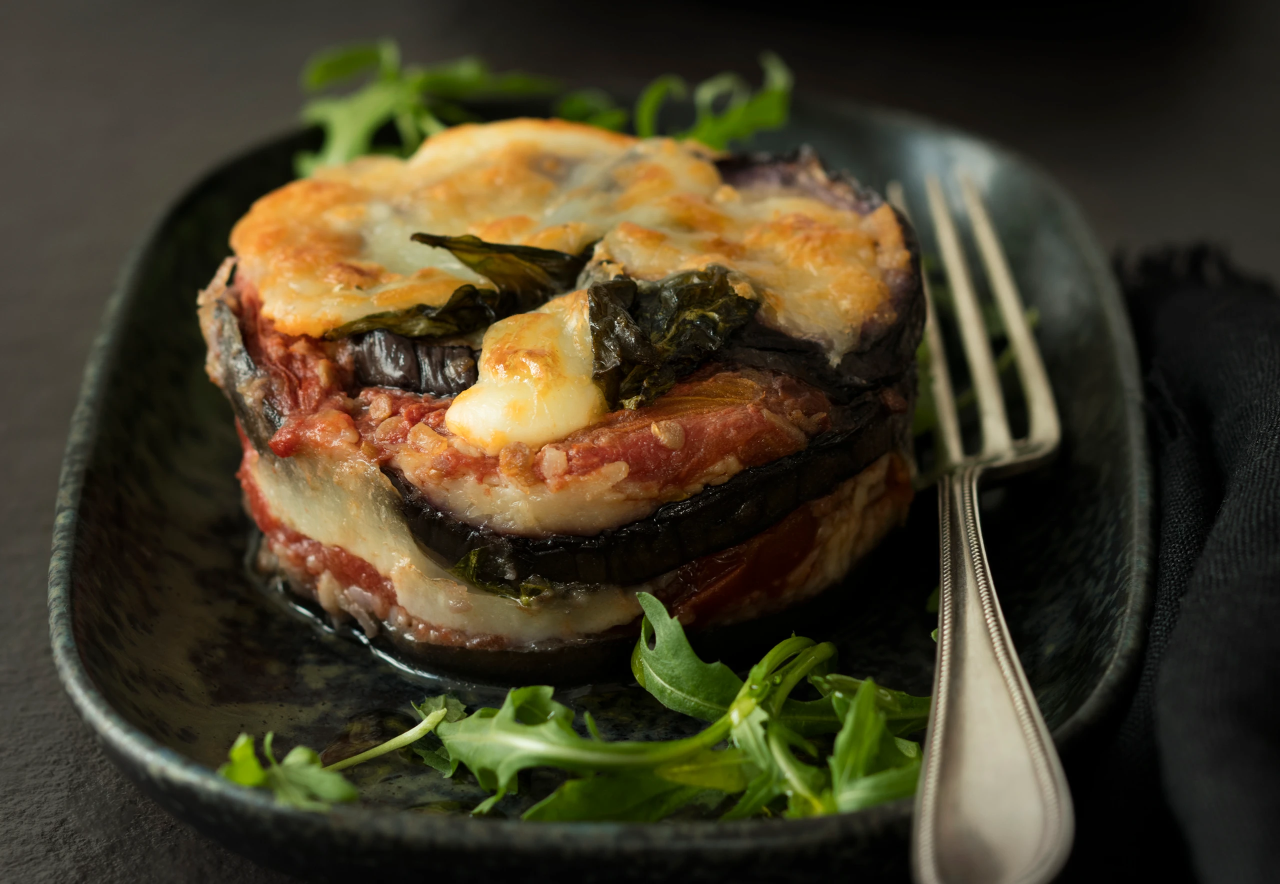 Mozzarella-Melanzaniauflauf mit Rucolasalat