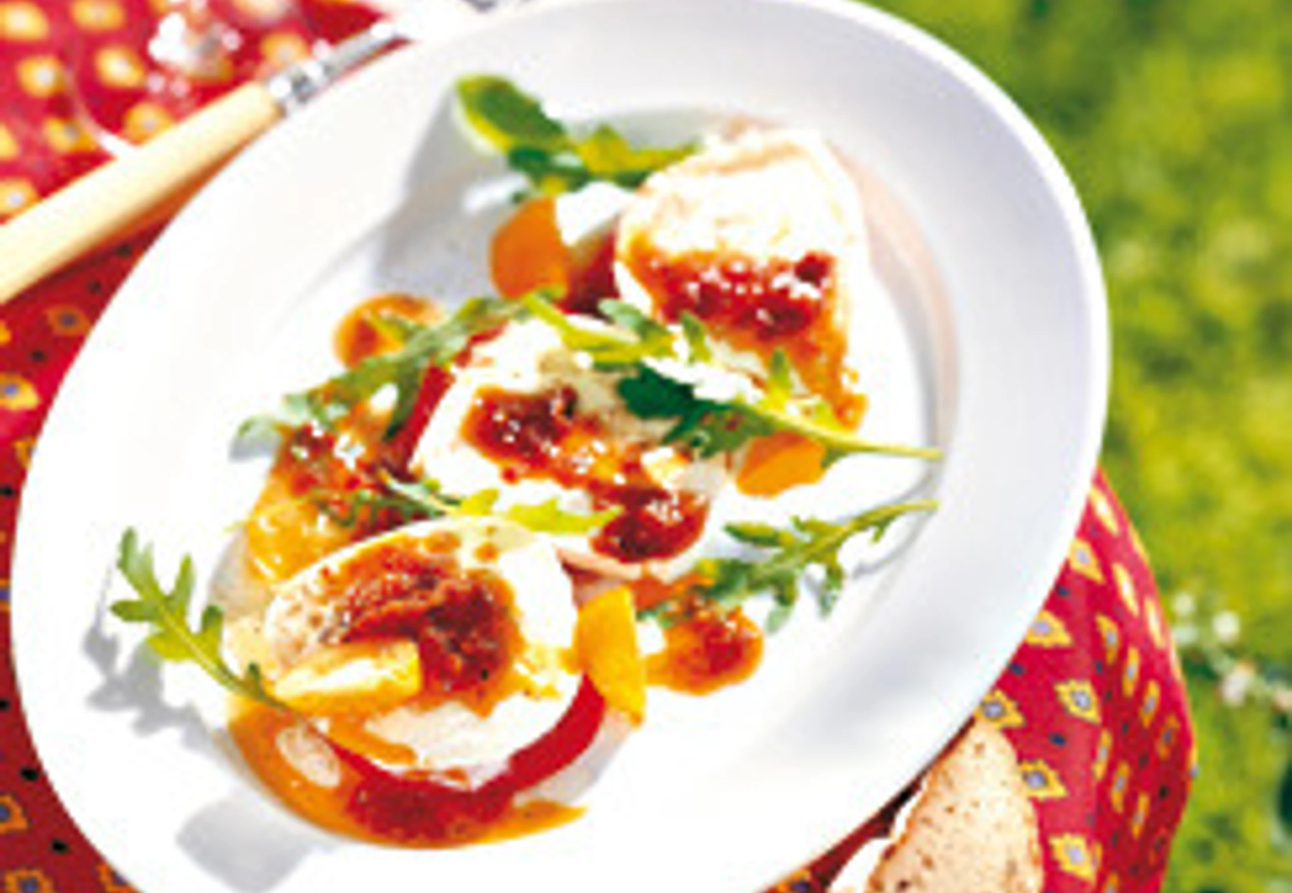 - Mozzarella anrichten, mit Paradeiserscheiben belegen, mit Pesto beträufeln und mit Rucola und Kirschparadeisern garnieren.