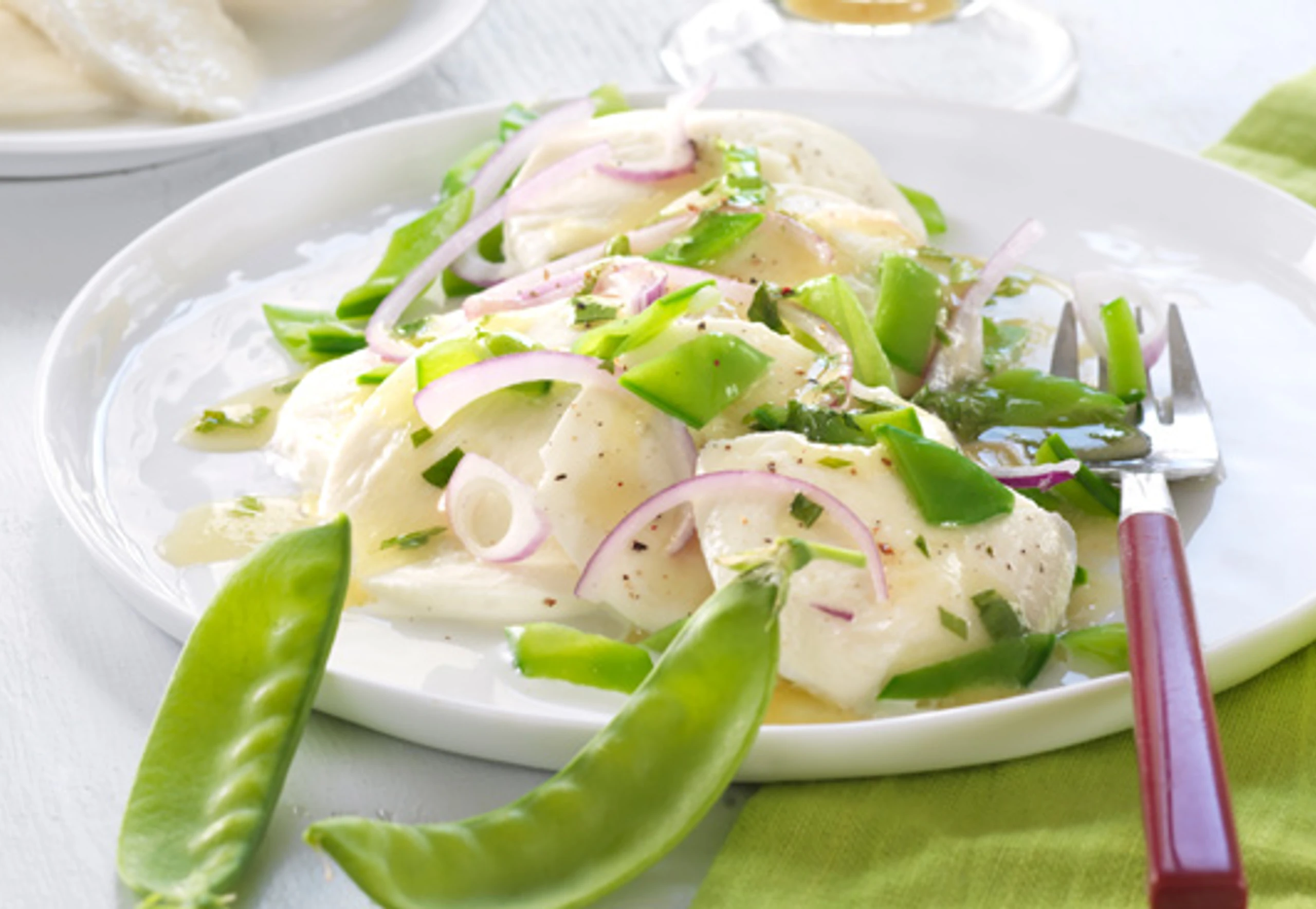 - Für die Marinade Balsamico salzen, pfeffern, mit je 1 EL Senf und Honig vermischen. Öl unterrühren. Zuckerschoten, Zwiebeln und Estragon mit der Marinade vermischen und kurz ziehen lassen.