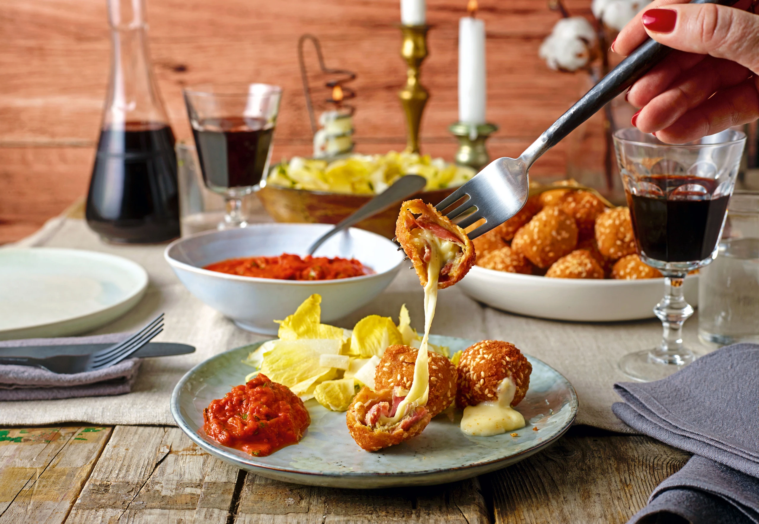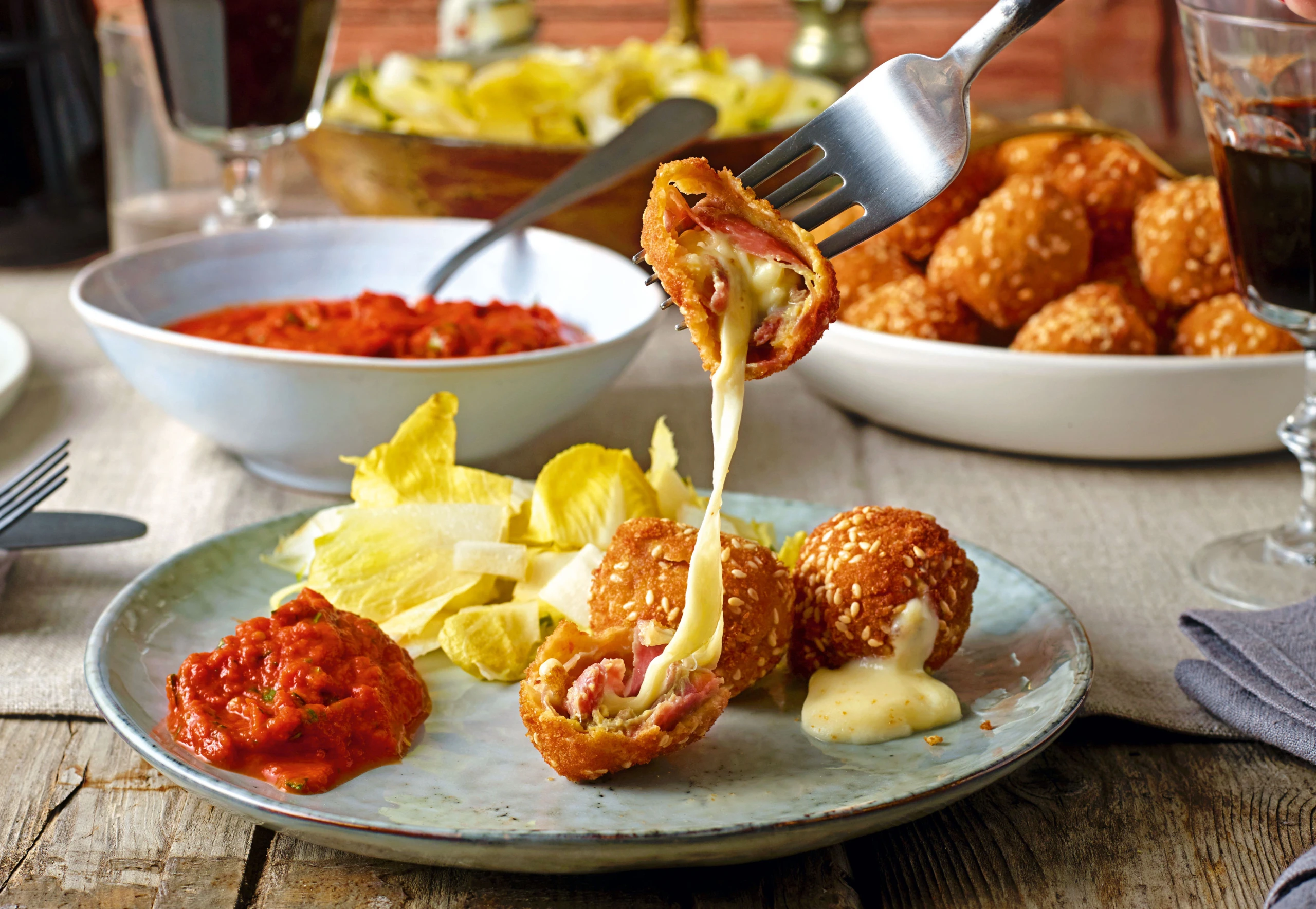 Mozzarella-Prosciuttobällchen mit Paradeiserdip und Chicoréesalat