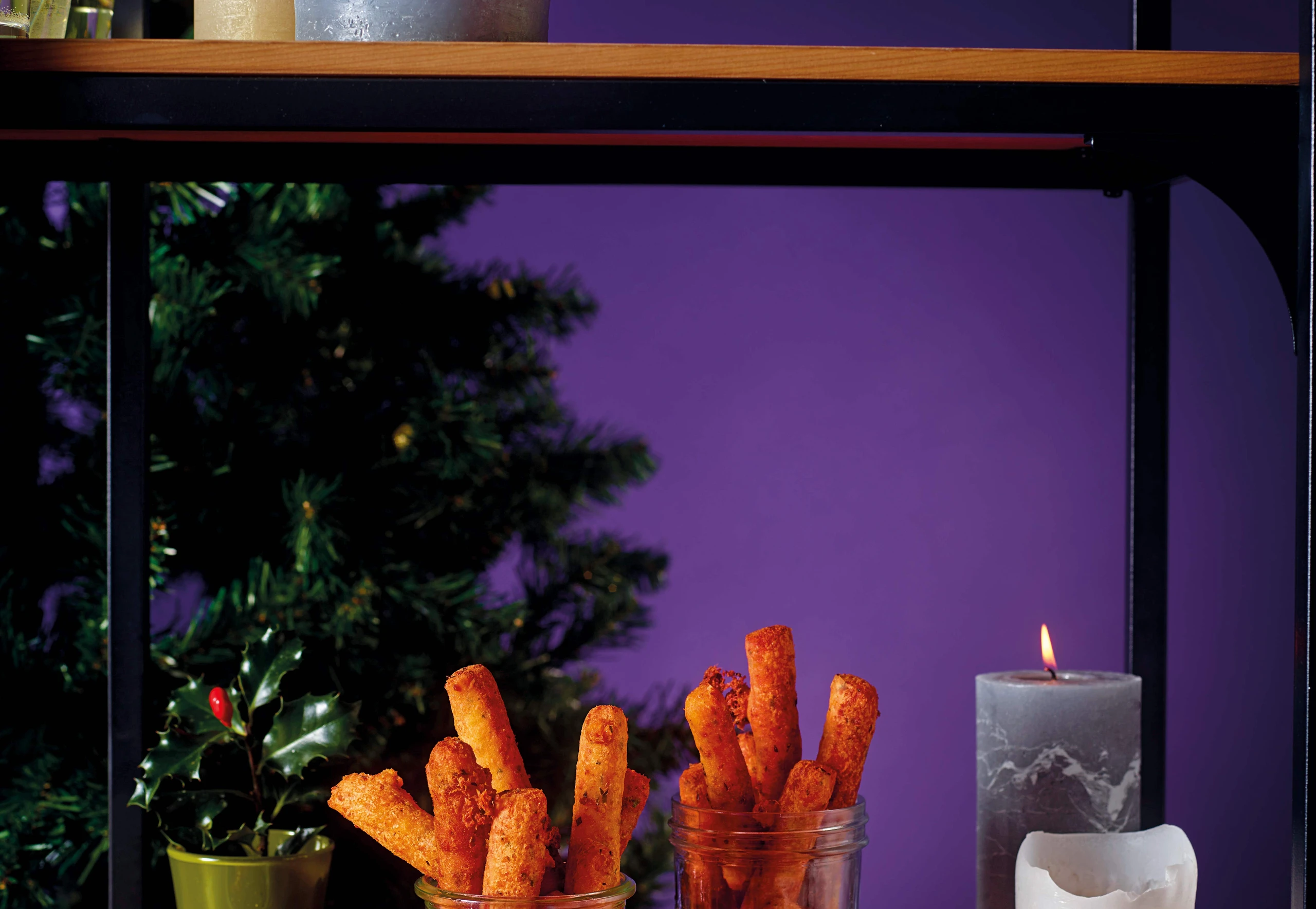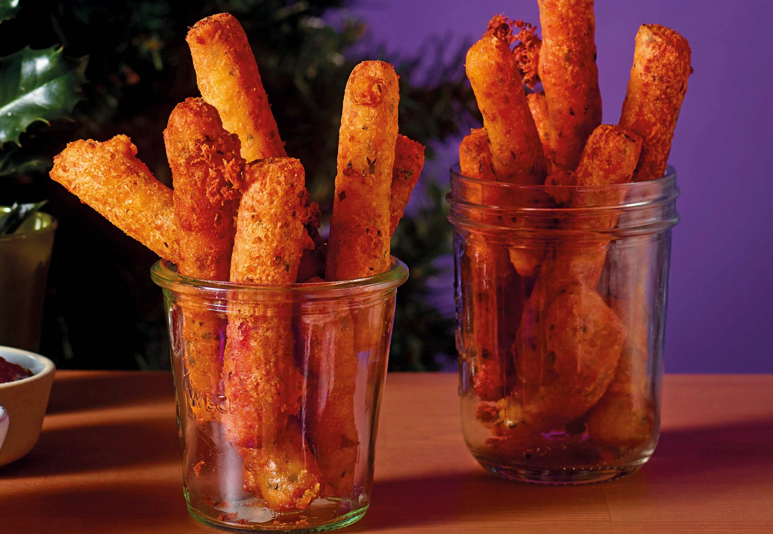 2 Finger hoch Öl in einer Pfanne erhitzen. Sticks einlegen und rundum goldbraun backen. Herausnehmen und auf Küchenpapier abtropfen lassen.