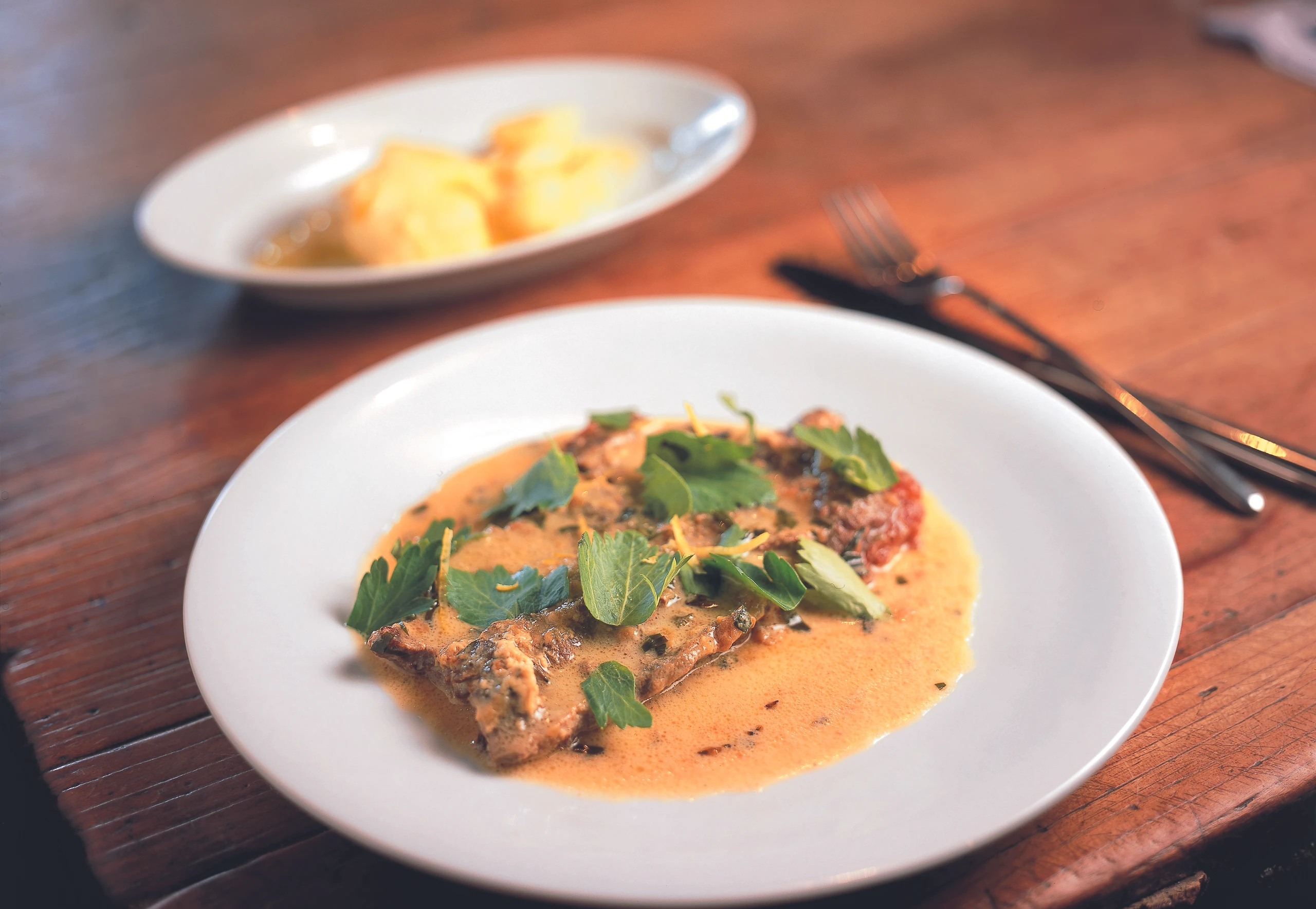 Fleisch aus der Sauce nehmen und warm stellen. Sauce durch ein feines Sieb gießen und mit Zitronenzesten, gehacktem Maggikraut und Selleriegrün vollenden. Mit kalter Butter binden. Dazu passen Erdäpfel.