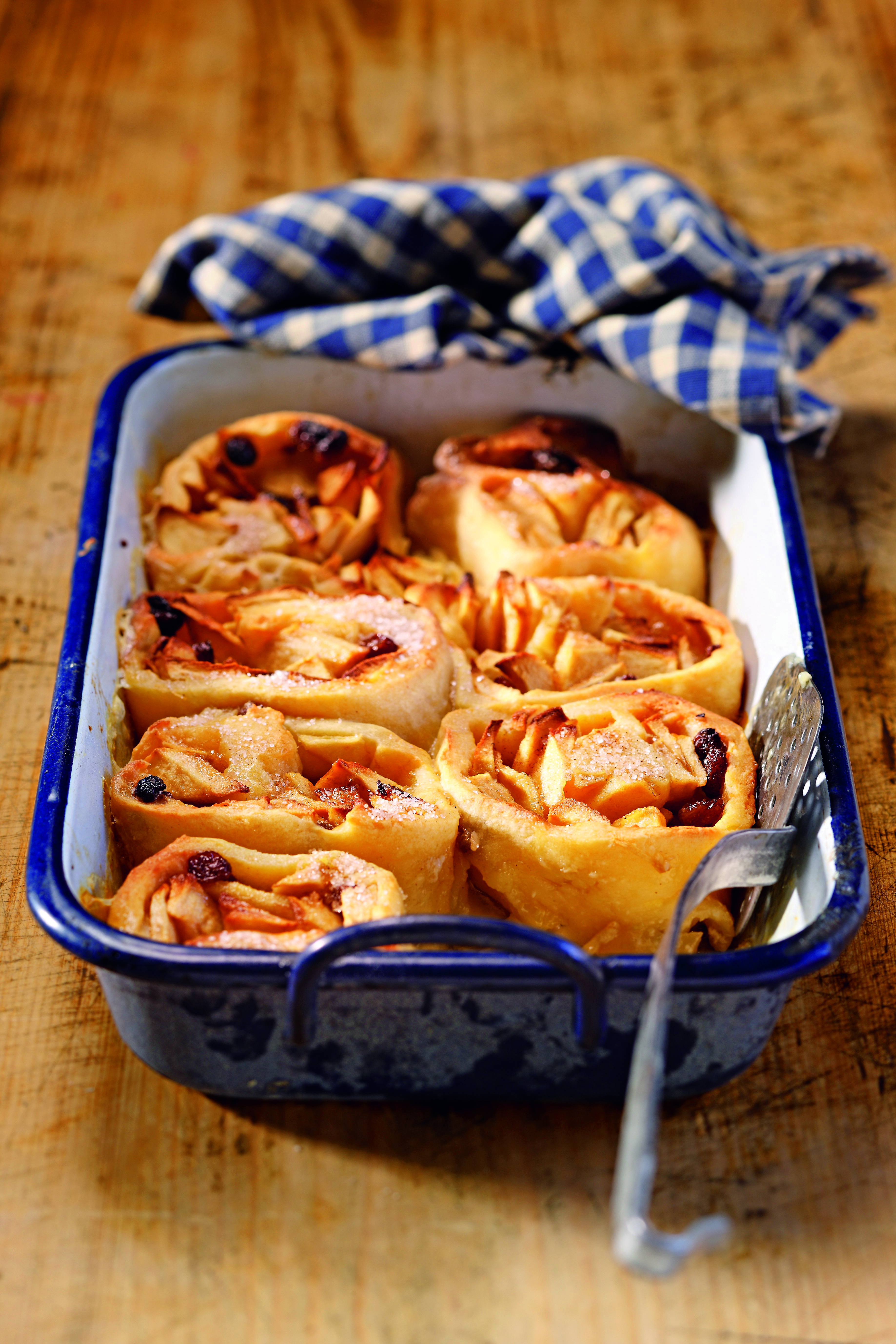 Teig auf einer bemehlten Arbeitsfläche rechteckig ca. 5 mm dick ausrollen, mit Butter bestreichen, mit Äpfeln, Rosinen, Zimt und Zucker bestreuen.