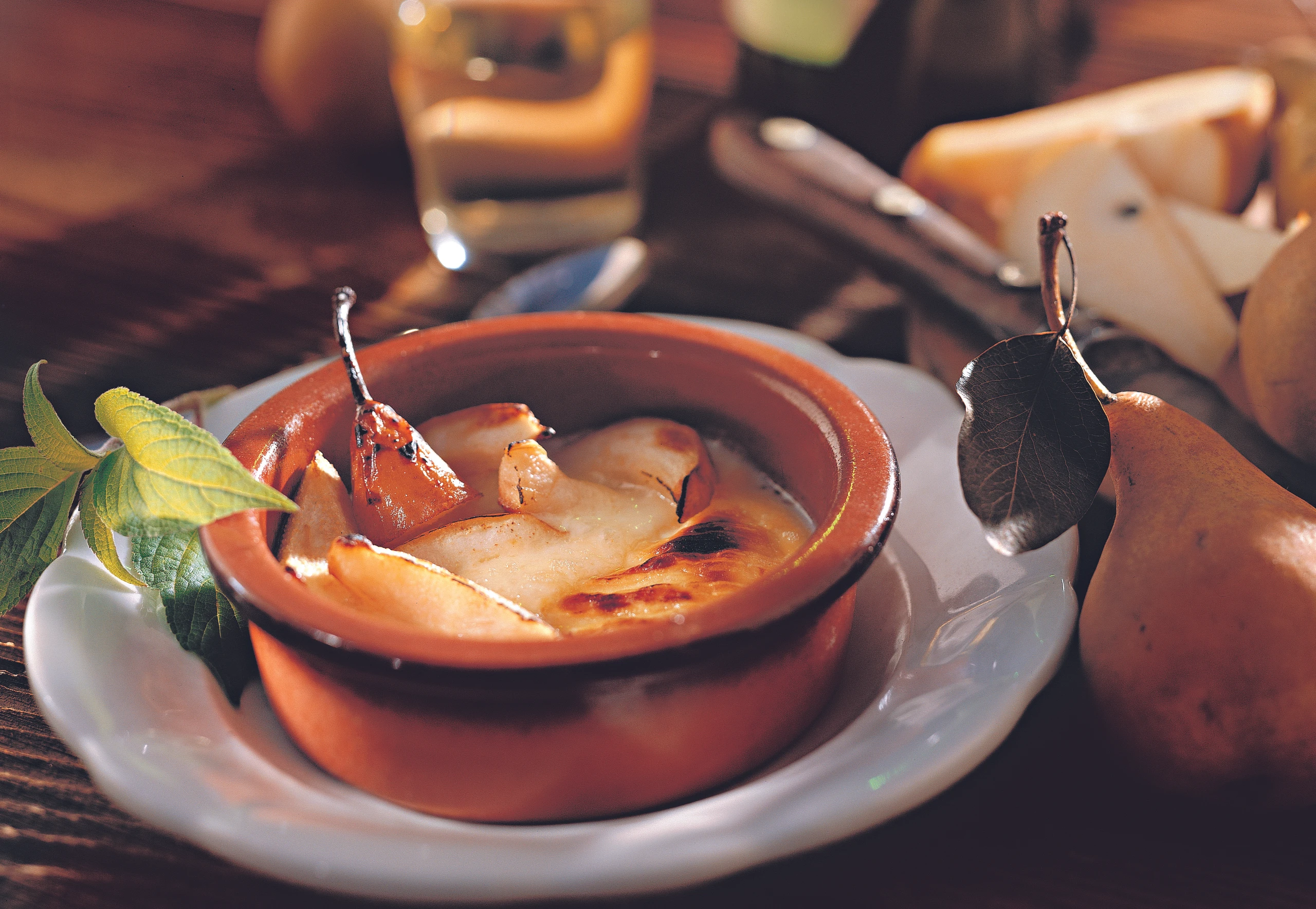 Käselaibe halbieren, jede Hälfte in eine feuerfeste Portionsform geben, den freien Platz mit Birnenstücken auffüllen, Riesling darüber gießen.
