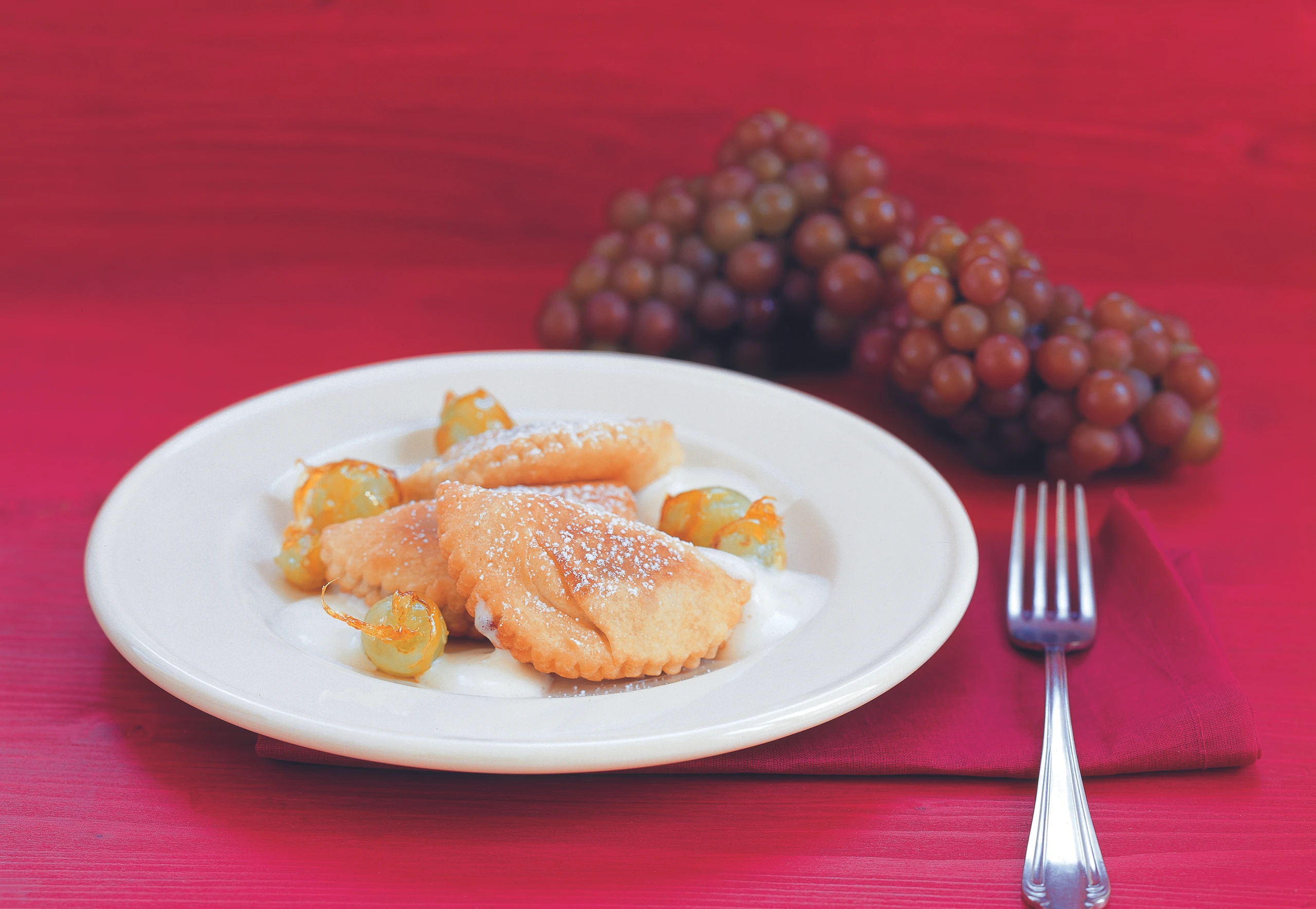 Teig auf einer bemehlten Arbeitsfläche 2–3 mm dick ausrollen, gezackte Scheiben (Ø ca. 11 cm) ausstechen, mit Ei bestreichen und mit je 1 TL Fülle belegen. Scheiben zusammenklappen und festdrücken.