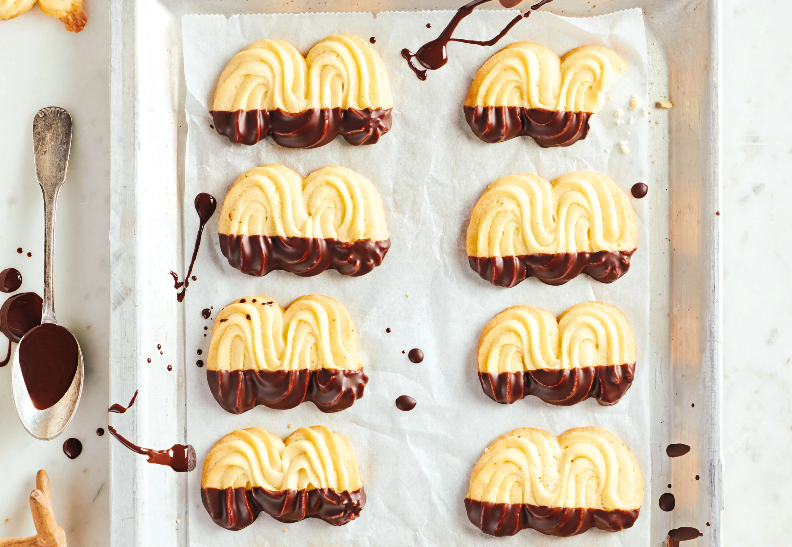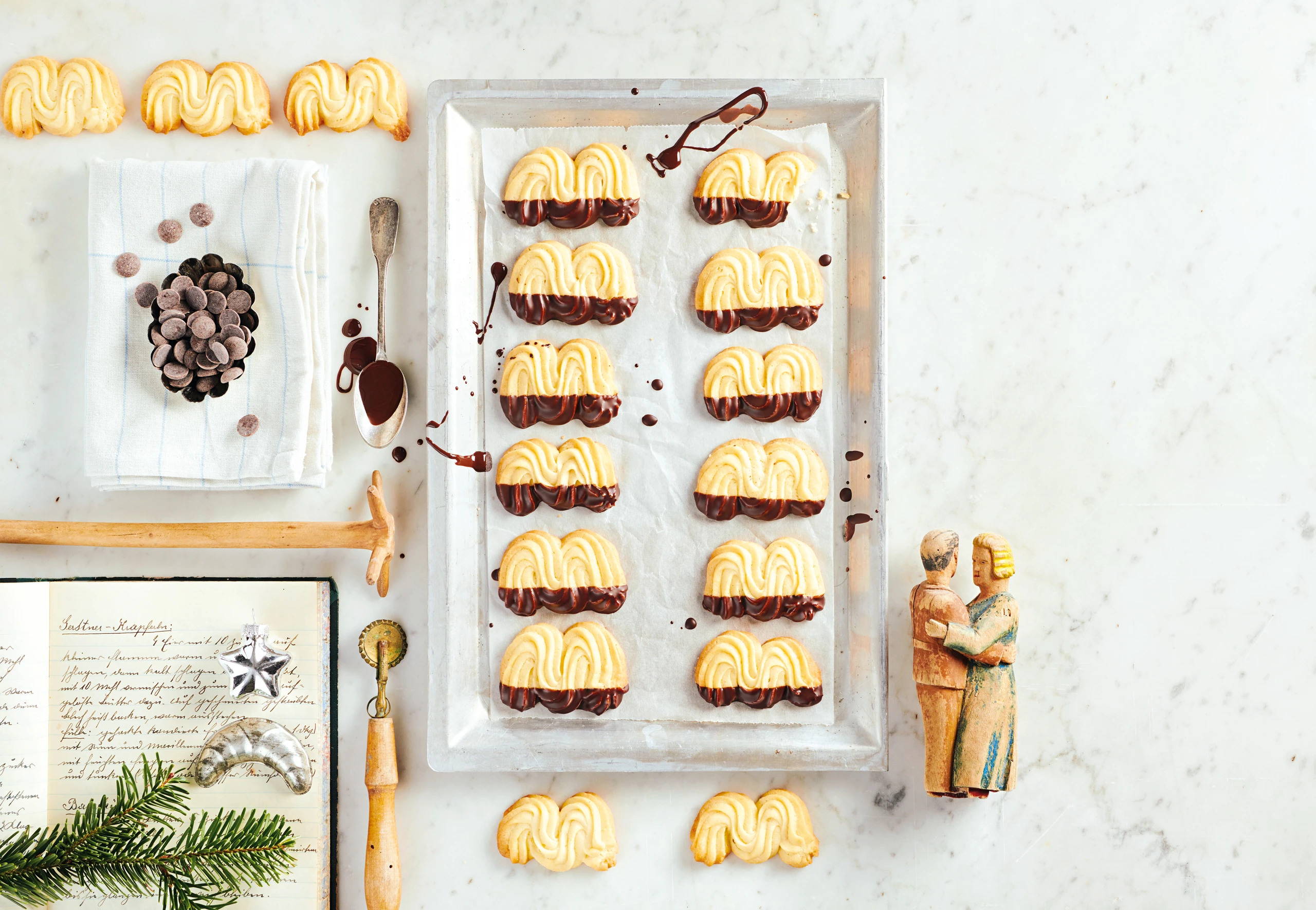 Teig in einen Dressiersack mit Sterntülle füllen und Kekse auf die Bleche dressieren. Nacheinander im Rohr (mittlere Schiene) ca. 15 Minuten hell backen, herausnehmen und auskühlen lassen.