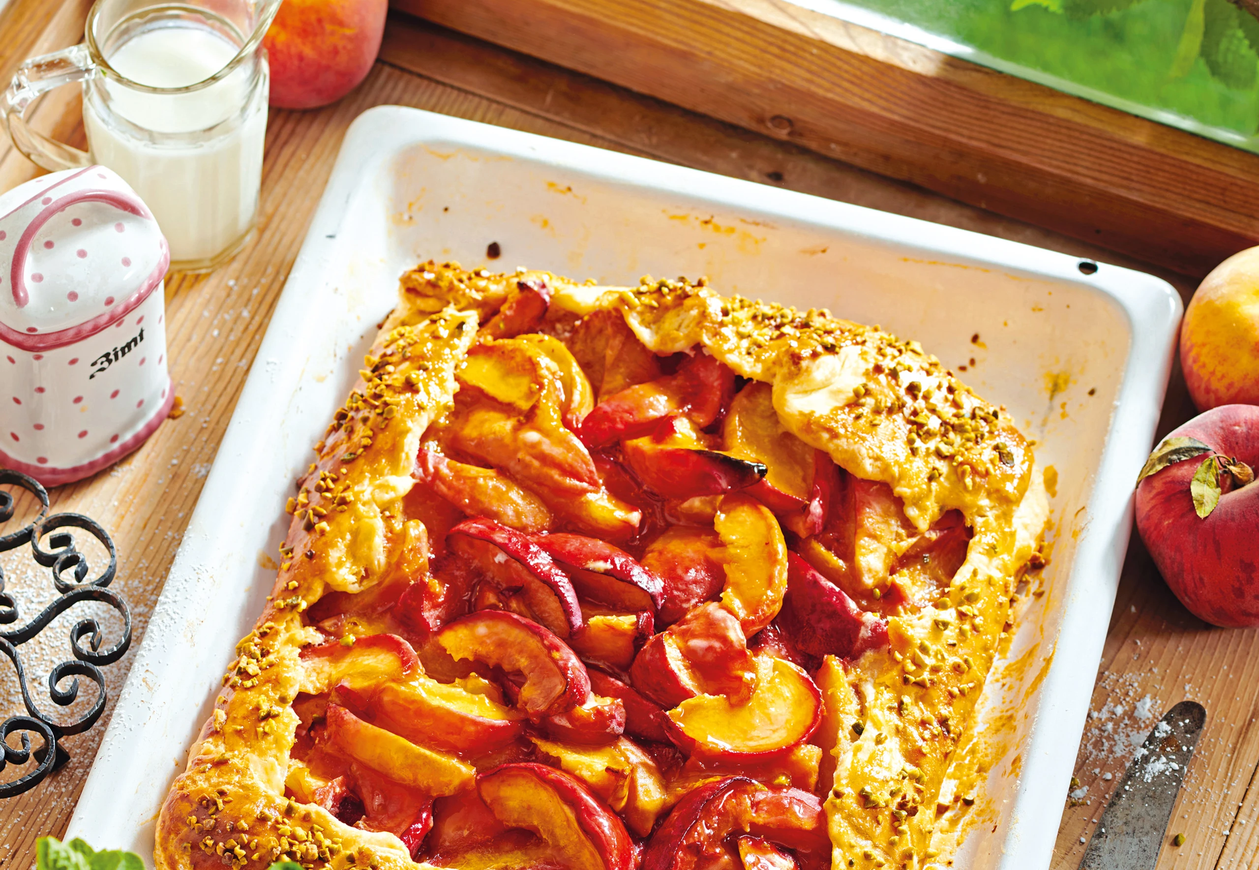 Teig auf einer bemehlten Arbeitsfläche ausrollen, auf das Blech legen und mit Nüssen bestreuen. Pfirsichspalten mit Stärke, übrigem Zucker und Vanillezucker vermischen und auf dem Mürbteig verteilen, den Rand aussparen. Teigrand über die Fülle einschlagen und vorsichtig andrücken. Rand mit Ei bestreichen und mit Pistazien bestreuen.