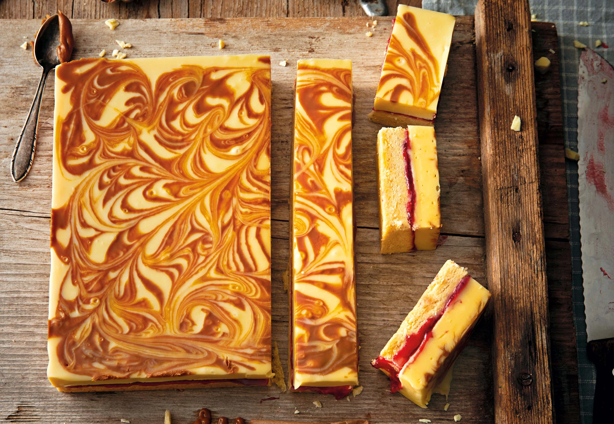 Erdnussbutter erwärmen, Schnitte damit beträufeln. Rasch mit einer Messerspitze marmorieren. Schnitte für mind. 3 Stunden kalt stellen. 30 Minuten vor dem Servieren aus dem Kühlschrank nehmen, aus der Form heben und in Stücke schneiden.