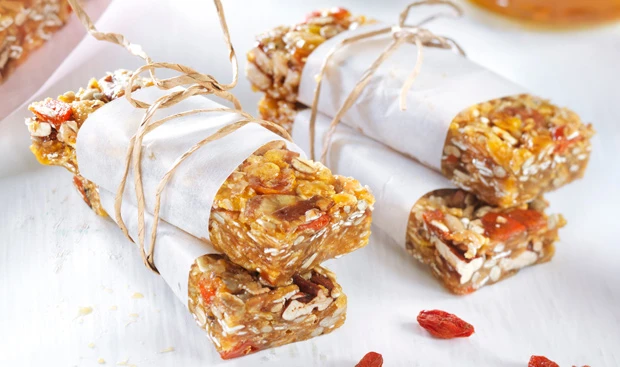 - Müslischnitte in ca. 10 x 3 cm große Rechtecke schneiden. Stücke mit Backpapier umwickeln, an einem trockenen Ort aufbewahren.
