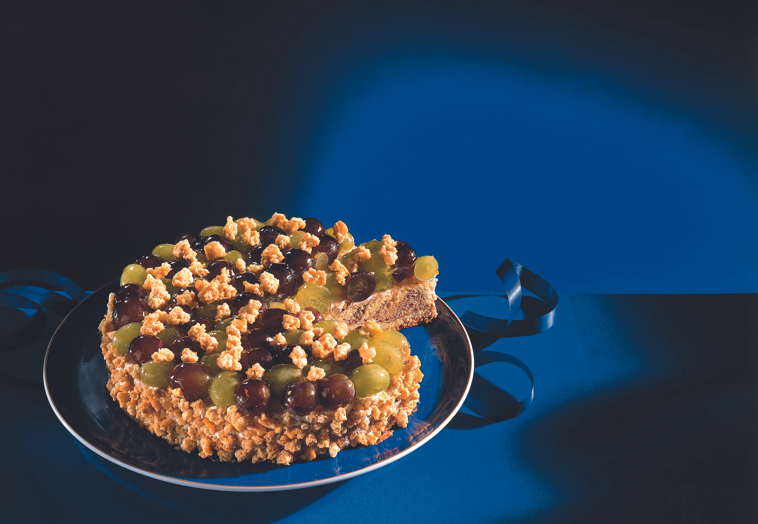 Torte aus dem Rohr nehmen, ca. 10 Minuten rasten lassen, dann auf ein mit Kristallzucker bestreutes Stück Backpapier stürzen und in der Form auskühlen lassen (dauert ca. 2 Stunden). Inzwischen Trauben abzupfen, waschen und trocken tupfen.