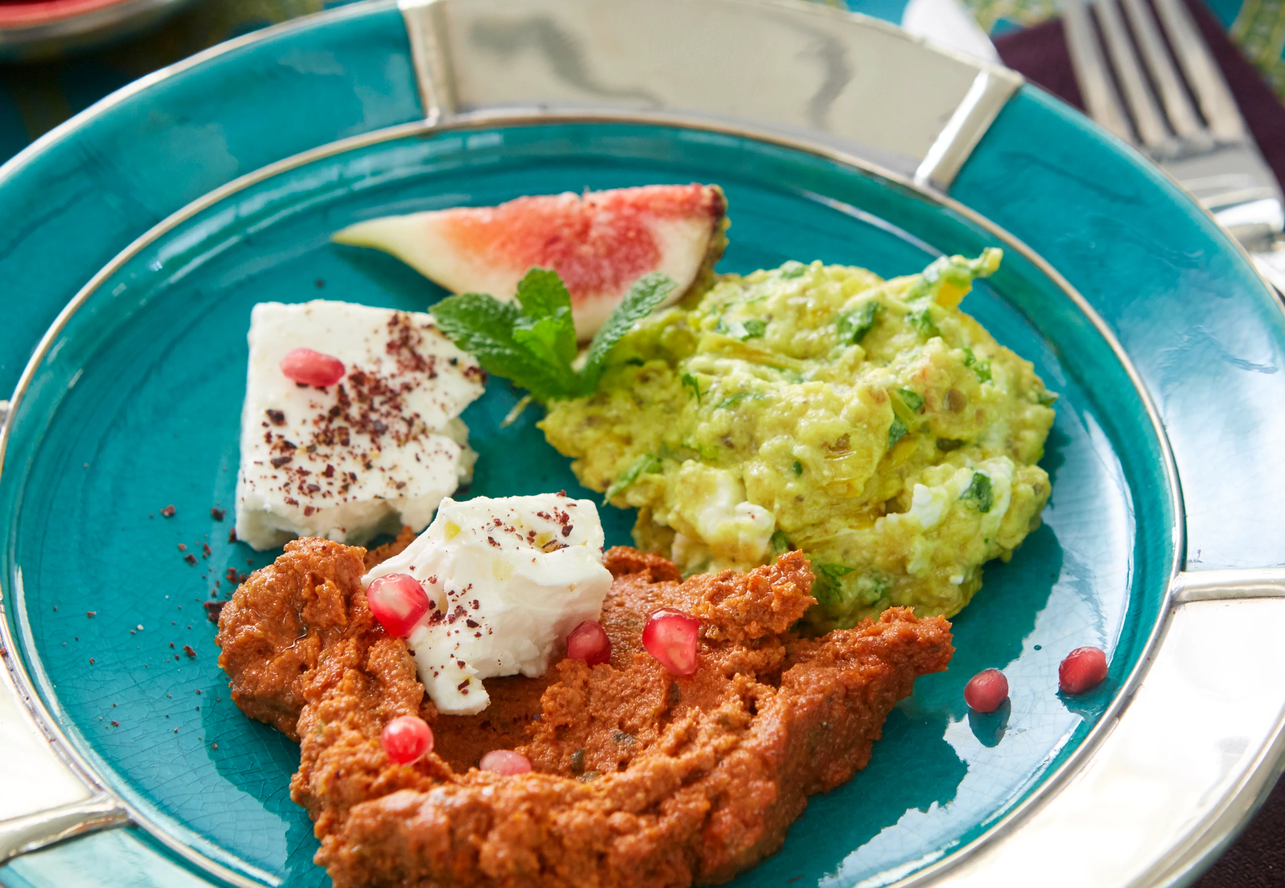 - Muhammara auf einem Teller verstreichen, mit Olivenöl beträufeln und mit Granatapfelkernen bestreuen.