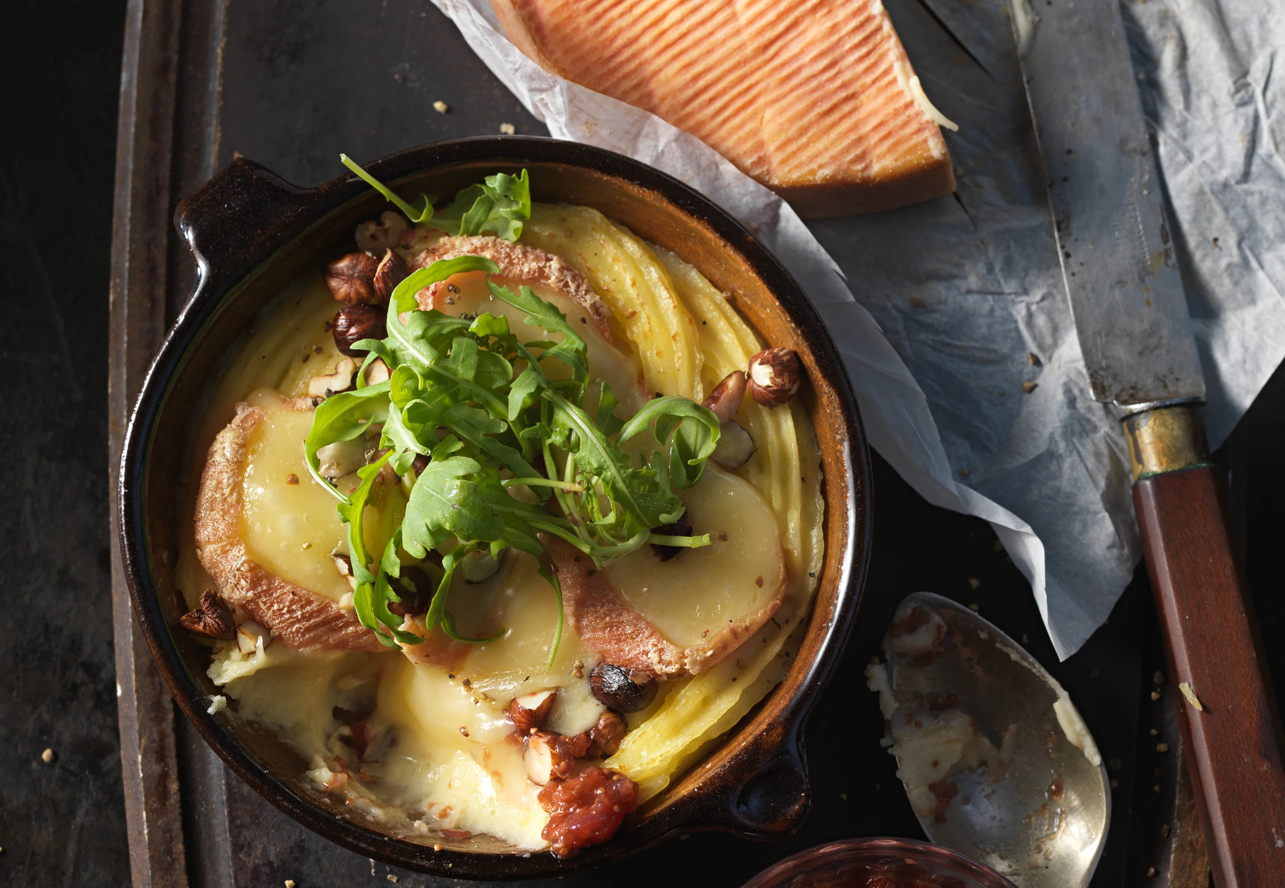Rohr auf 180°C vorheizen. Püree in einem Dressiersack mit Sterntülle füllen und in Tarteformen (Ø 13 cm) dressieren. Käse in 1 cm dicke Scheiben schneiden, auf das Püree legen. Haselnüsse grob hacken und darüber streuen.