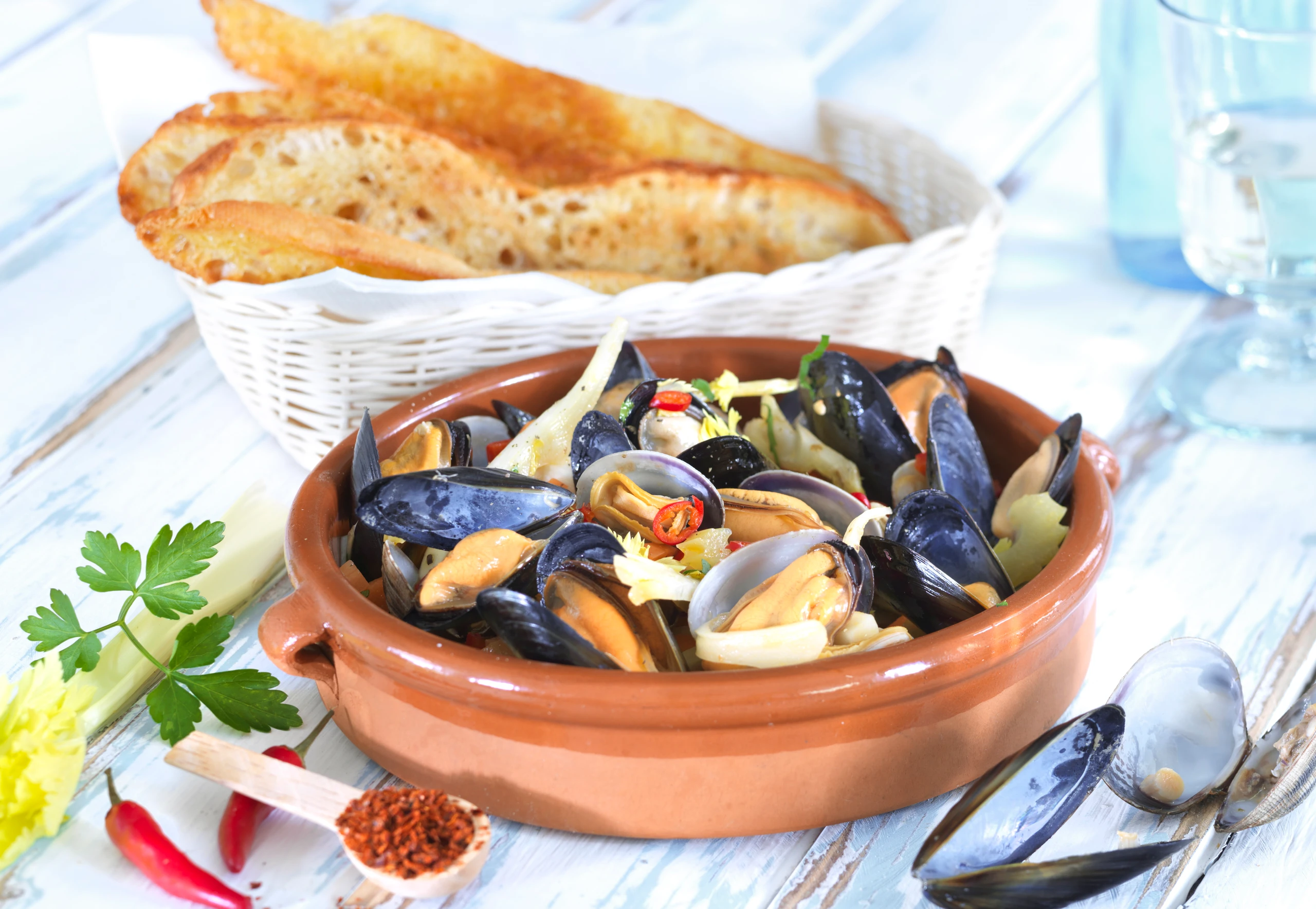 Gusto-Tipp: Frische Muscheln sind im Rohzustand geschlossen. In kaltem Wasser öffnen sich die Schalen, schließen sich allerdings an der Luft wieder. Beim Kochen öffnen sich die Muscheln, solche, die roh bereits offen oder nach dem Garen noch geschlossen sind, bitte wegwerfen, sie sind verdorben.