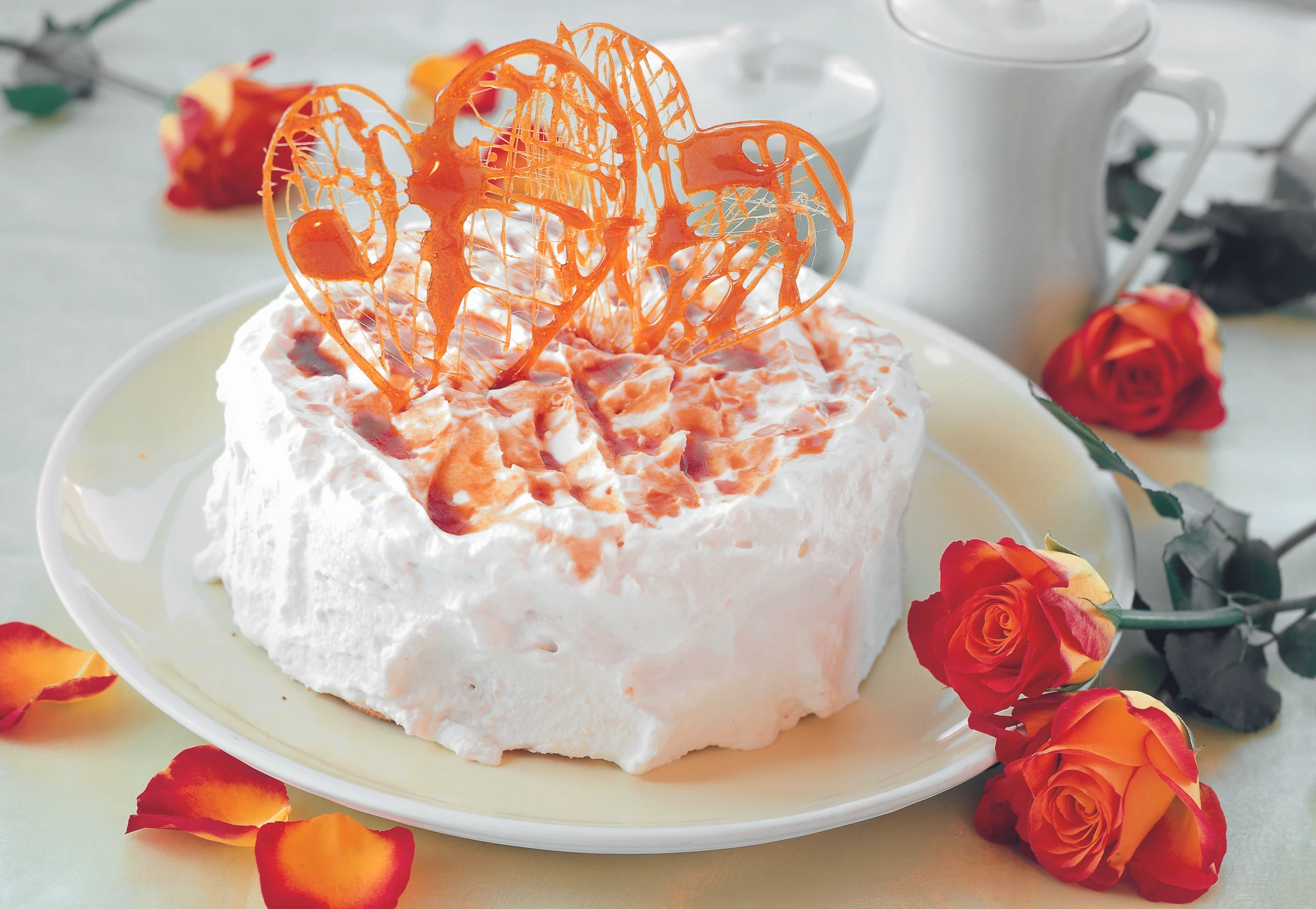 Für den Karamell Zucker mit 4 EL Wasser verrühren und aufkochen. Bei schwacher Hitze köcheln, bis der Zucker beginnt, hellbraun zu karamellisieren. Karamell vom Herd nehmen und mit einem Kochlöffel dünne Fäden in Form von 2, ca. 10 cm großen Herzen auf Backpapier gießen.