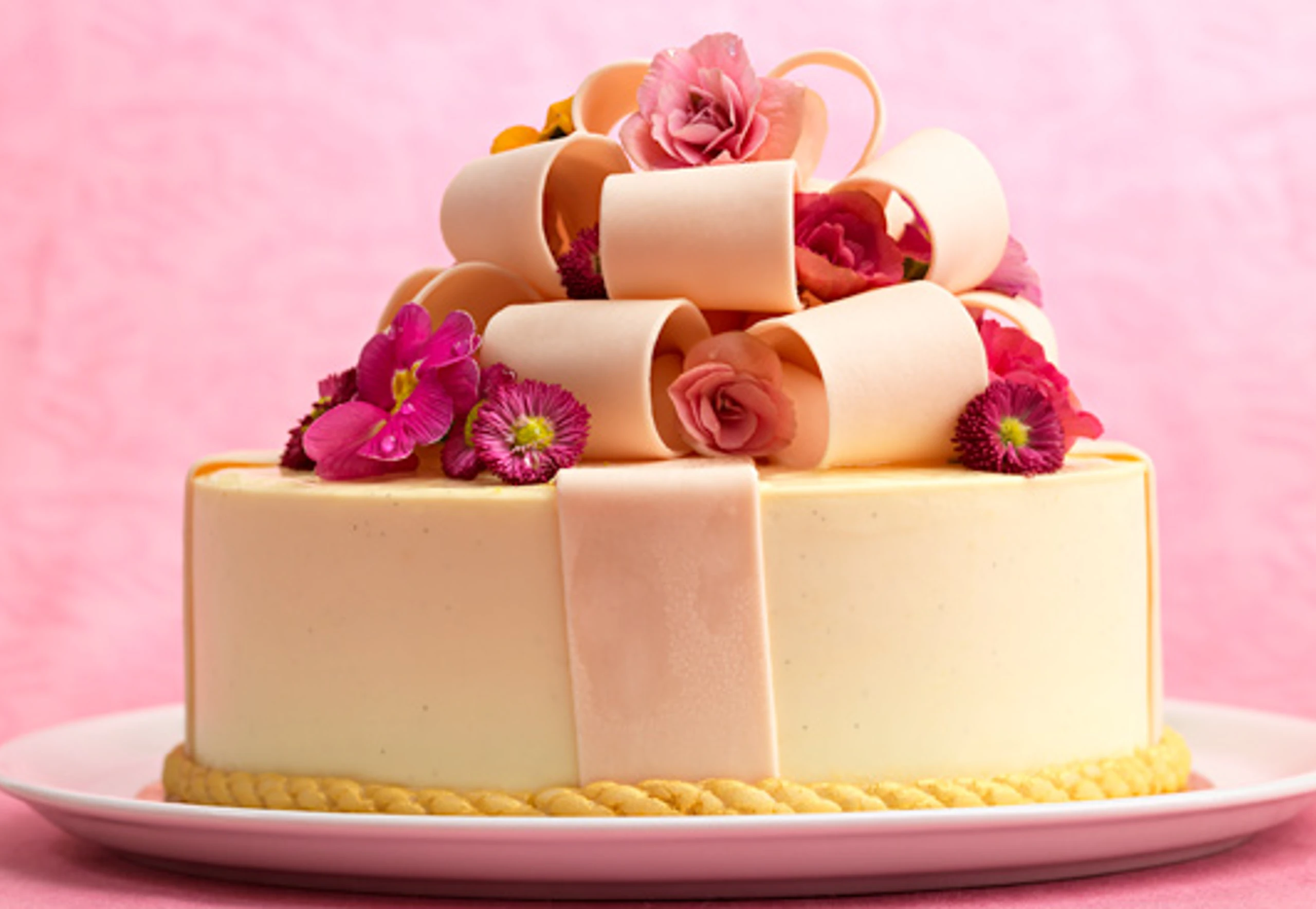 Torte aus dem Reifen lösen. Marzipan auf Staubzucker 3 mm dick ausrollen, 2 Streifen (3 x 35 cm) ausschneiden und kreuzweise über die Torte legen. Aus dem übrigen Marzipan 18 Streifen (3 x 14 cm) ausschneiden, zu Schlaufen formen und auf der Torte drapieren. Torte mit Blüten dekorieren.