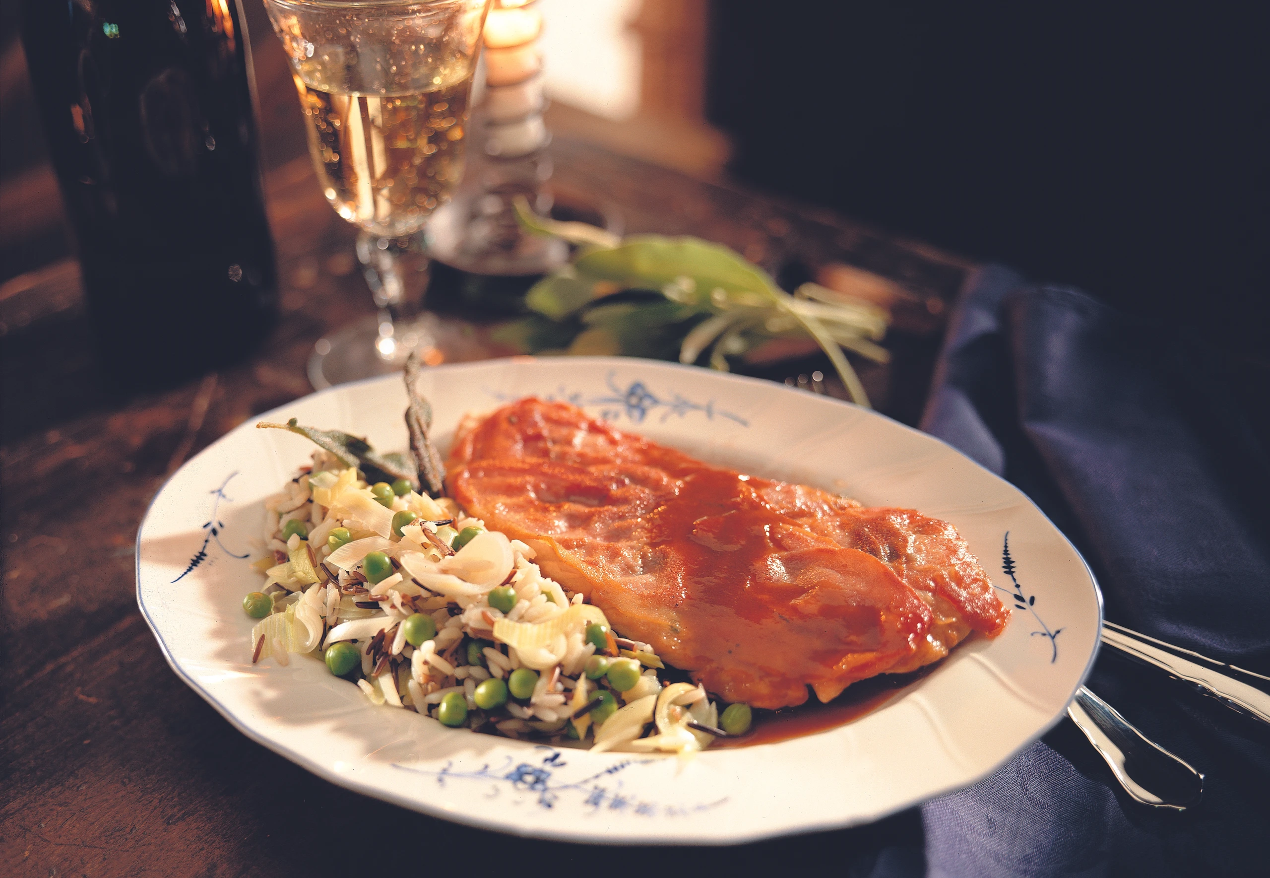 Naturschnitzel mit Rohschinken und Salbei, dazu gemischter Reis mit Gemüse