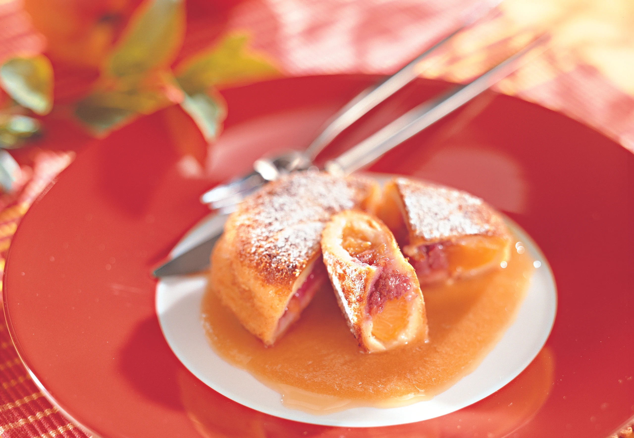 Pofesen abtropfen lassen, mit Staubzucker bestreuen und auf der Sauce anrichten.
