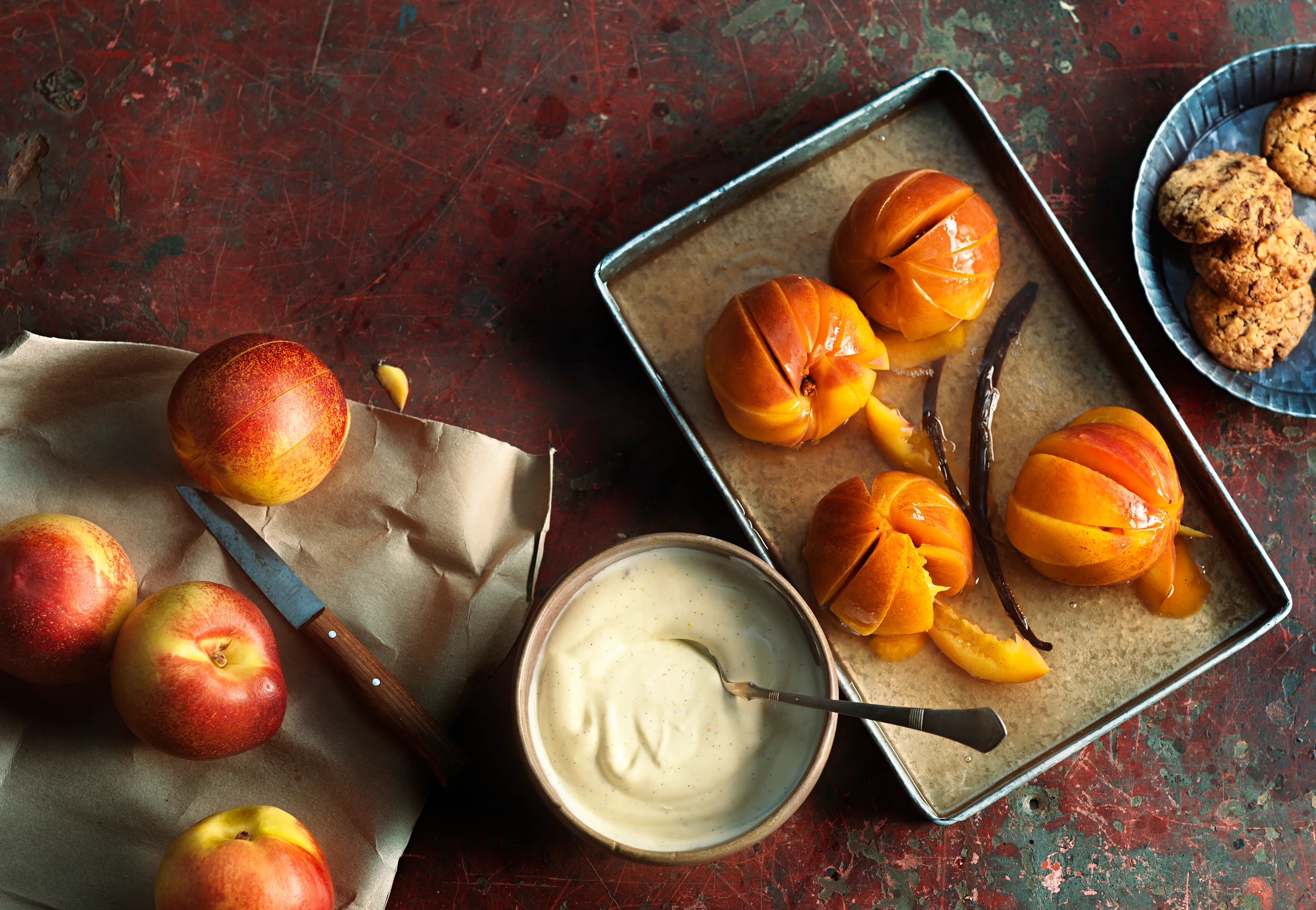 Nektarinen mit einem Gitterlöffel aus dem Sud heben, abtropfen lassen und mit Vanillecreme und Cookies servieren.