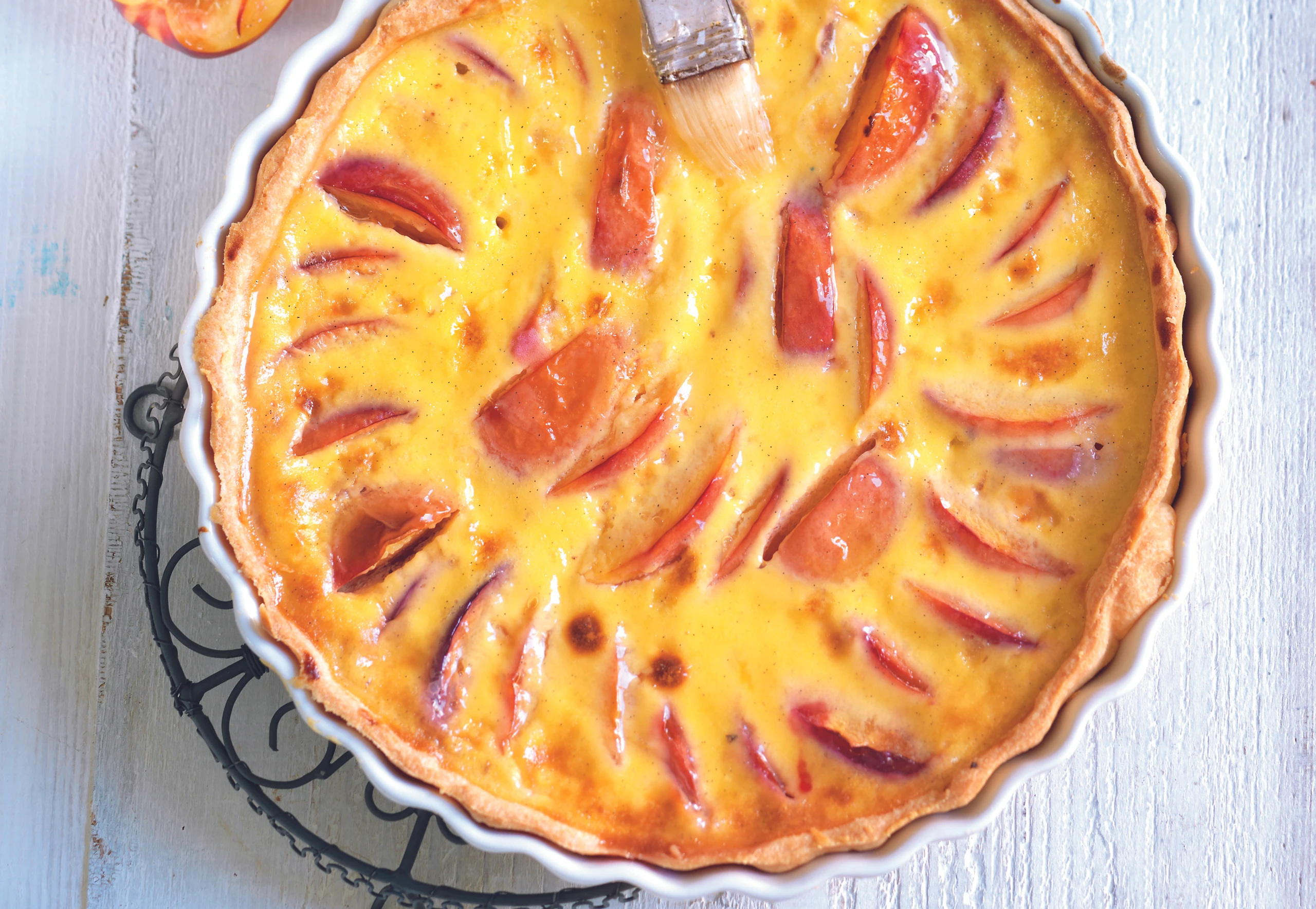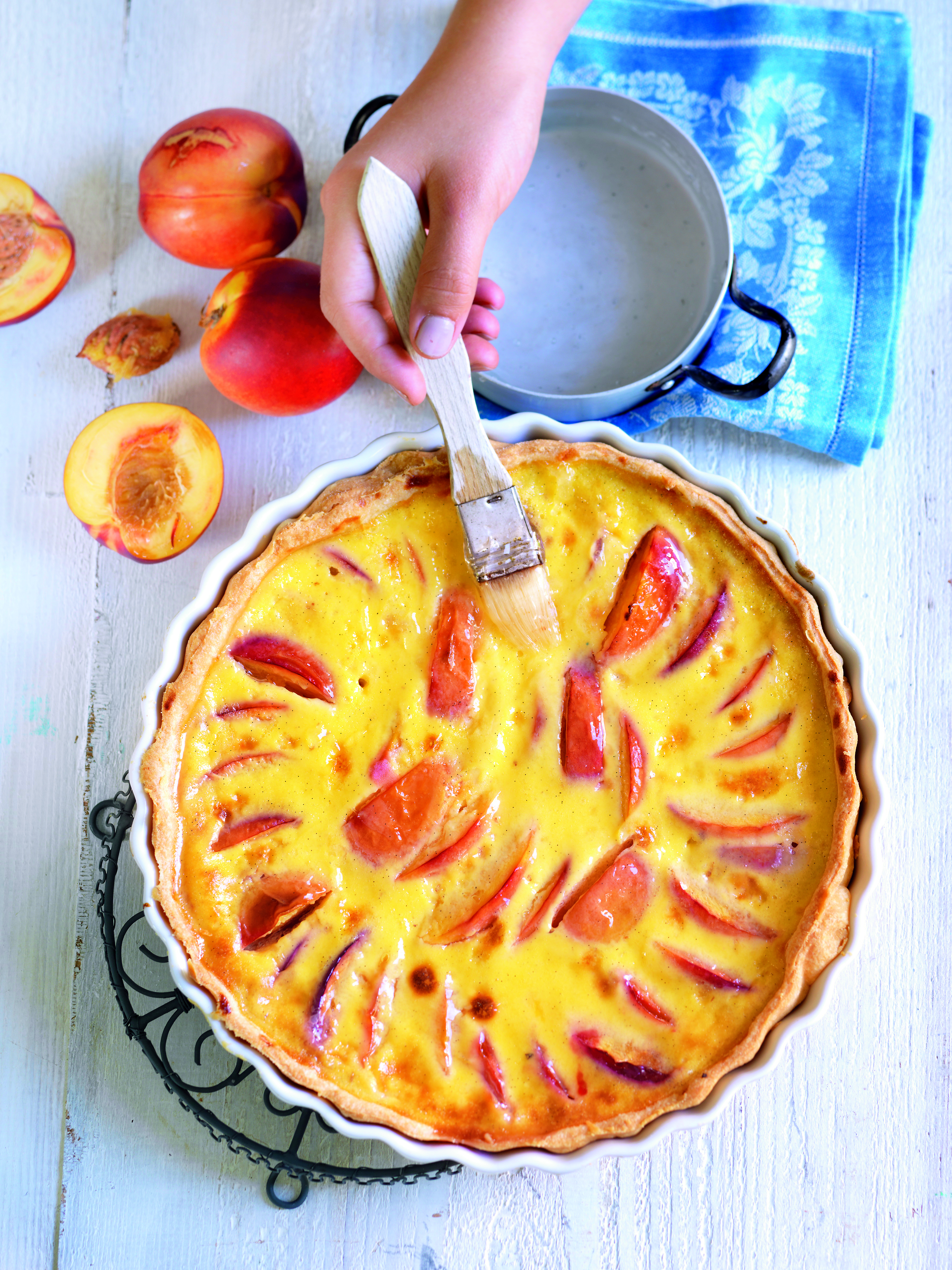 Teigboden einstechen und im Rohr (mittlere Schiene) 10 Minuten vorbacken. Boden mit den Nektarinen dicht belegen, Puddingmischung darauf verteilen. Kuchen im Rohr (untere Schiene / Gitterost) ca. 30 Minuten backen, herausnehmen und auskühlen lassen.
