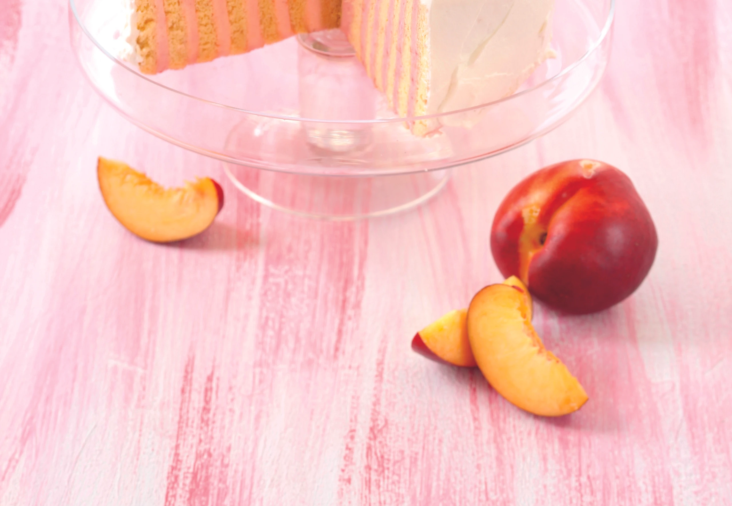 Für die Garnitur restliche Nektarinen in Spalten vom Kern schneiden. Übriges Obers schlagen. Torte aus der Form lösen, mit Obers rundum einstreichen, mit Nektarinen und Kuvertüre garnieren.
