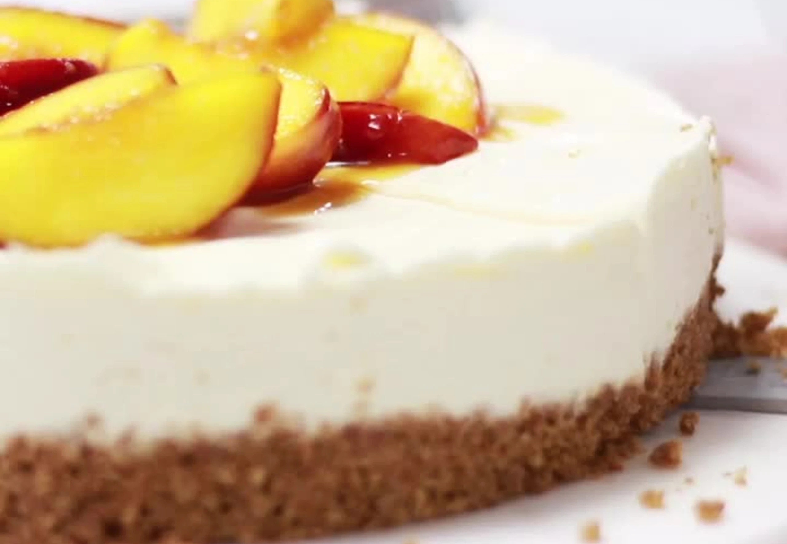 Torte aus der Form lösen und mit den Pfirsichspalten belegen.