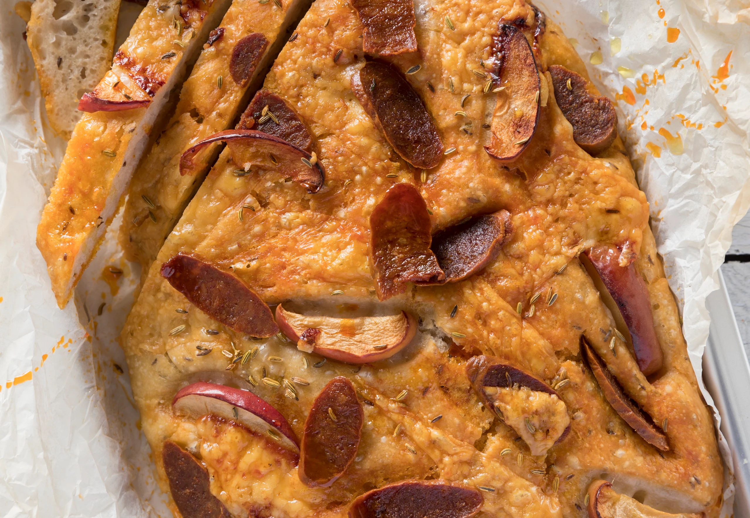 Teig auf das Blech leeren und mit Chorizo, Apfel und Gruyere belegen. Eventuell mit etwas Fenchelsamen und Kümmel bestreuen. Bread im Rohr (mittlere Schiene) 45 Minuten backen. Herausnehmen und mit Olivenöl zum Tunken servieren.