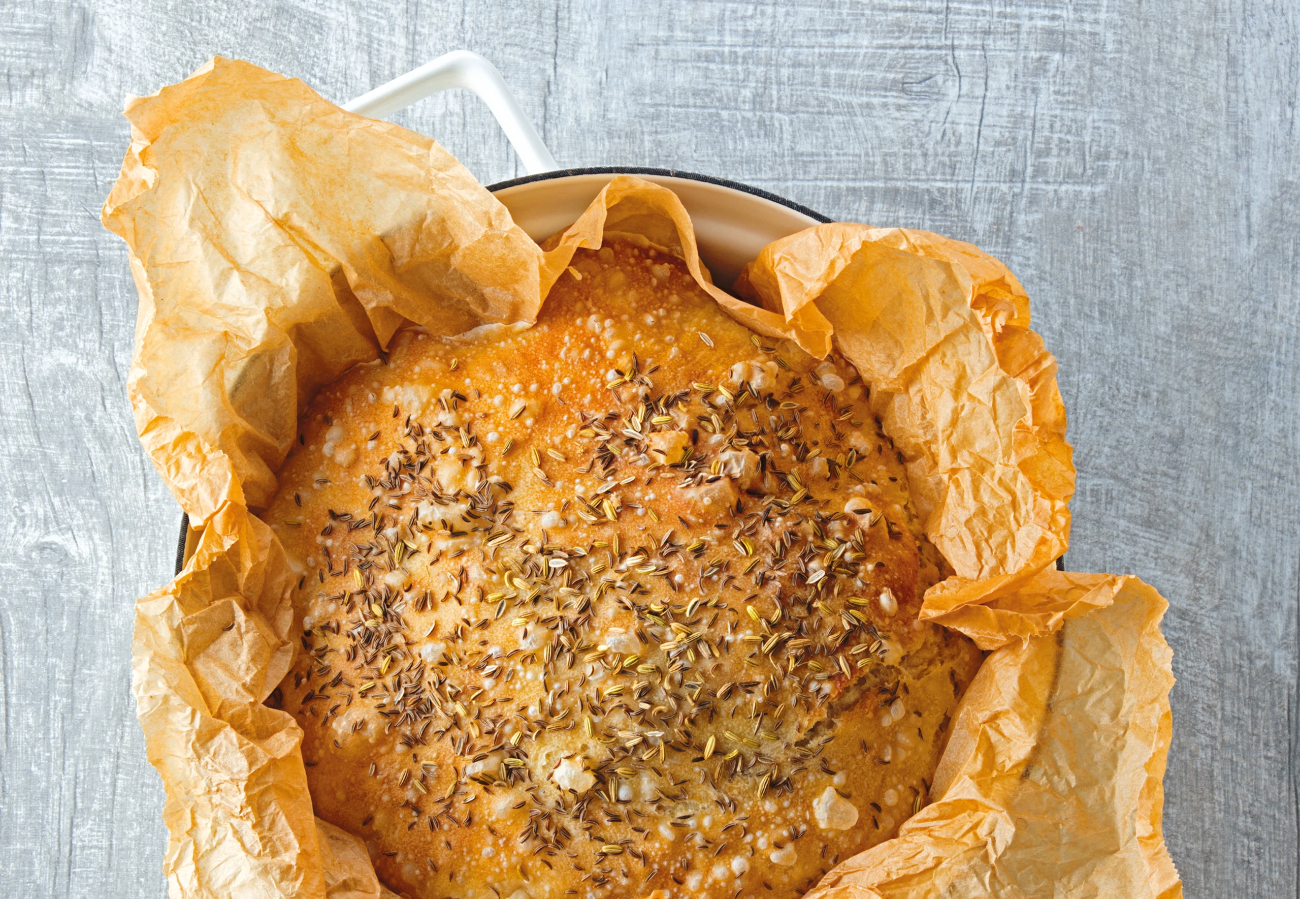 Rohr auf 200°C vorheizen. Einen runden Schmortopf mit Backpapier auslegen. Teig in den Topf leeren und mit Fenchelsamen und Kümmel bestreuen. Bread im Rohr (mittlere Schiene) ca. 45 Minuten backen. Herausnehmen und auskühlen lassen.