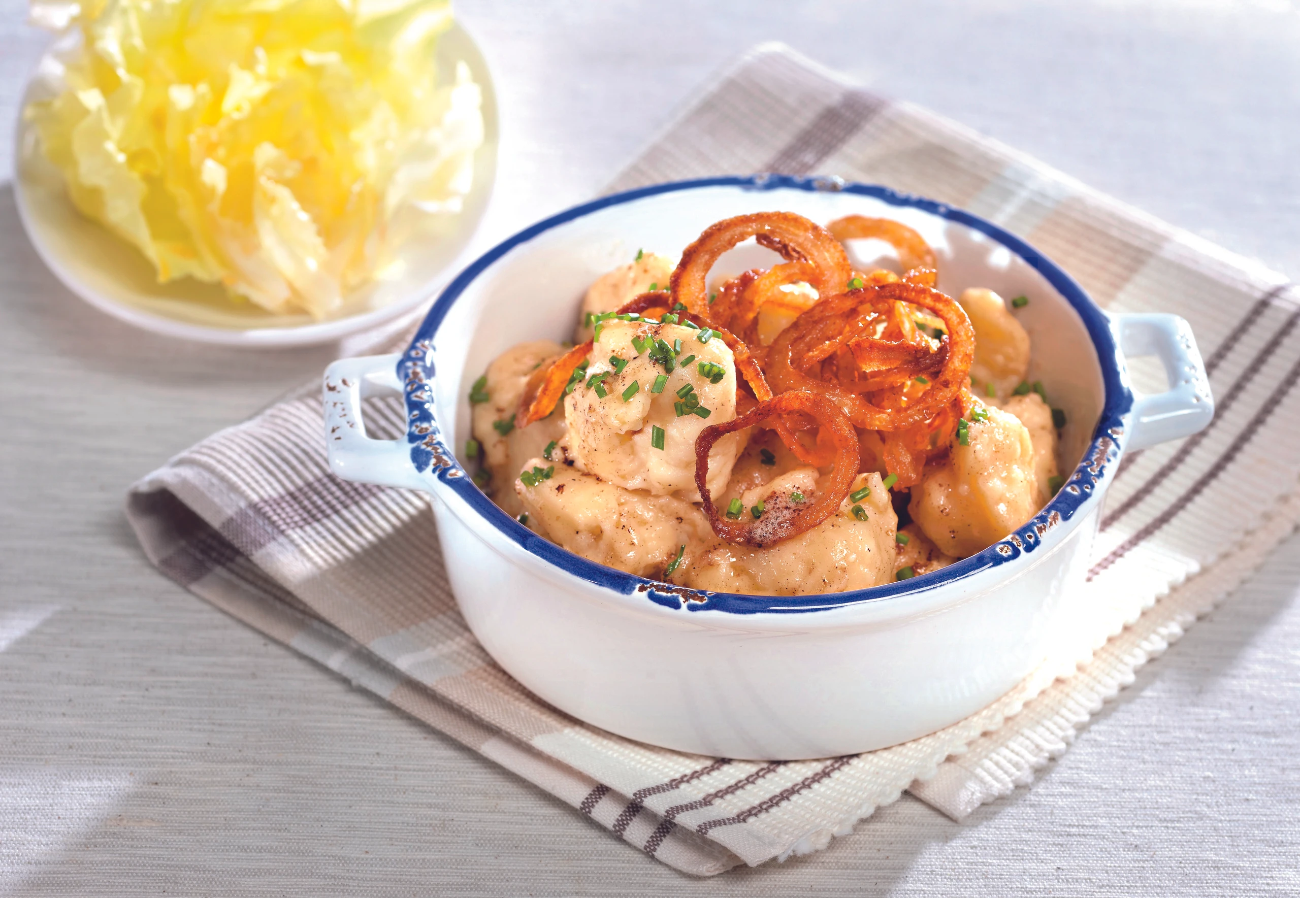 Übrige Butter bis zur leichten Braunfärbung erhitzen. Nockerln darin schwenken und mit Röstzwiebel anrichten. Dazu passt grüner Salat.