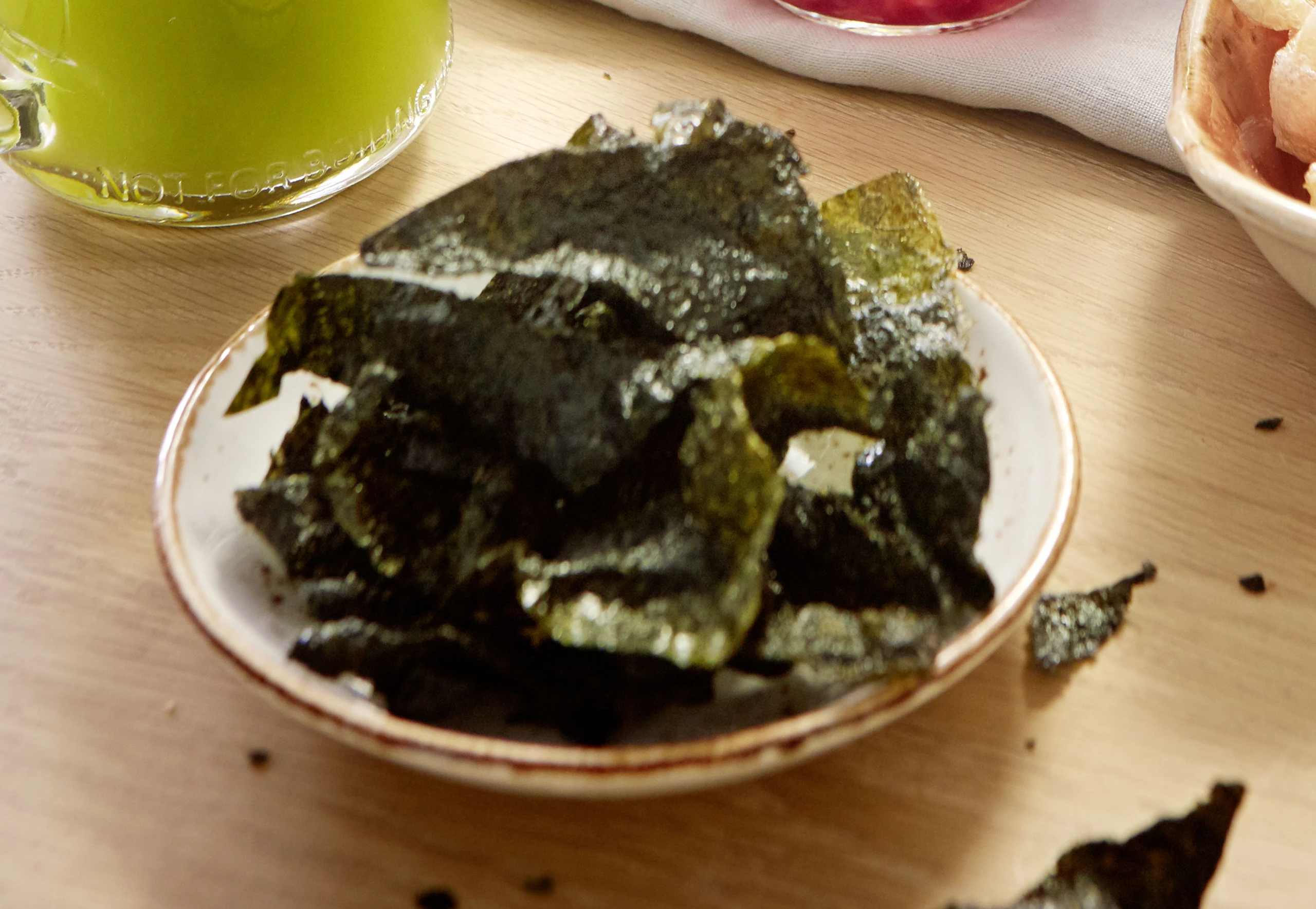 - Noriblätter in jeweils 8 Dreiecke schneiden. Rohr auf 150°C vorheizen. Backblech dünn mit Öl bestreichen. Noriblätter mit der glatten Seite nach unten darauf verteilen, dünn mit Öl bestreichen, salzen und im Rohr (mittlere Schiene) knusprig backen (ca. 3 Minuten). Herausnehmen und auskühlen lassen.