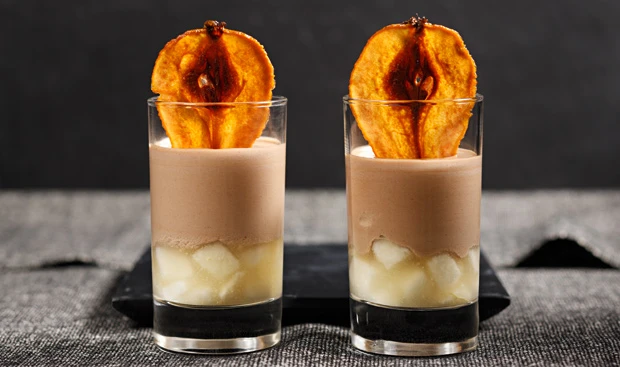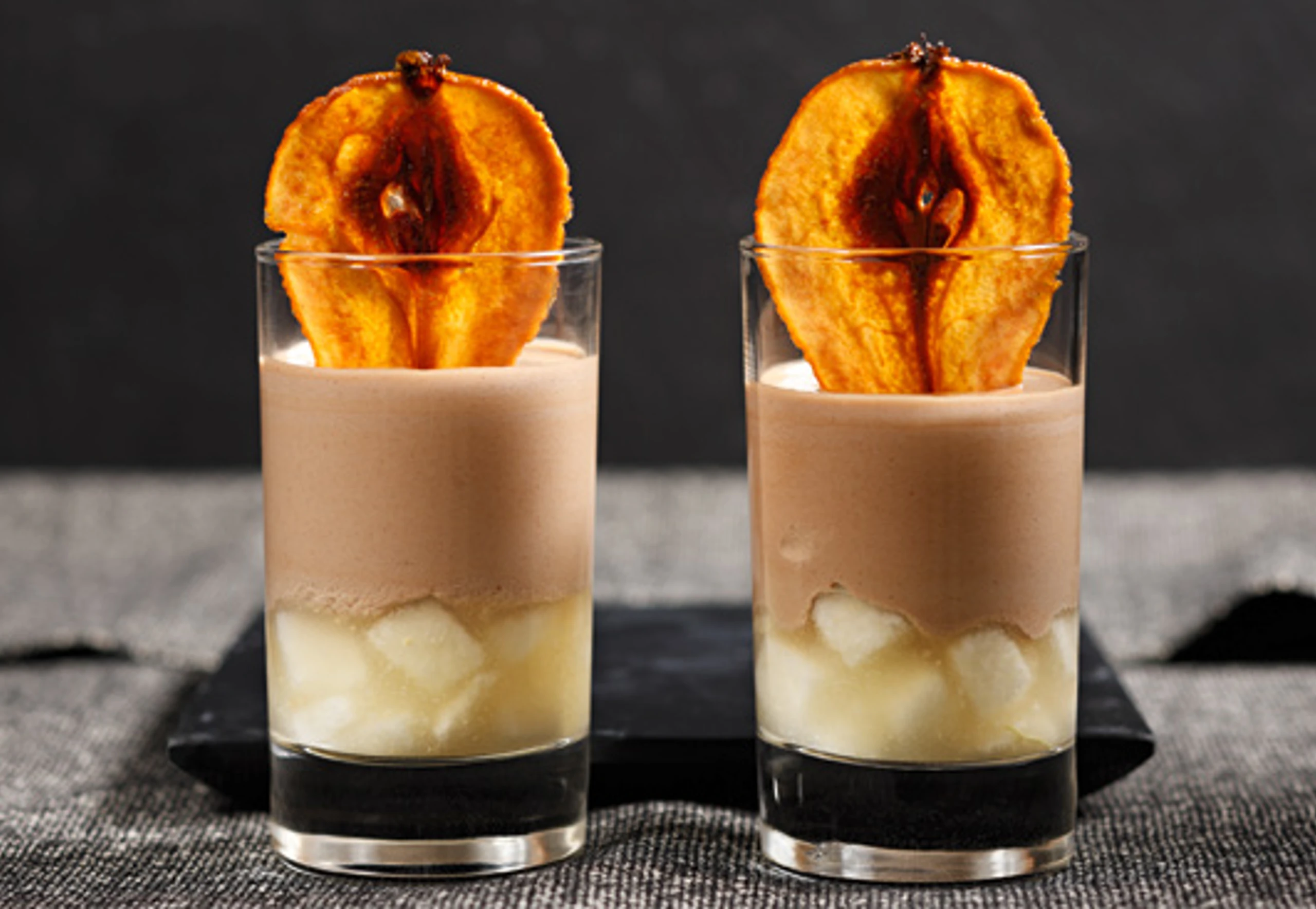 Für die Chips Rohr auf 80°C vorheizen. Backblech mit Backpapier belegen. 1 Birne der Länge nach in 3 mm dicke Scheiben schneiden, auf das Blech legen, mit 1 TL Zucker bestreuen und im Rohr (mittlere Schiene) 4 Stunden trocknen; Rohr dabei einen Spalt offen lassen.