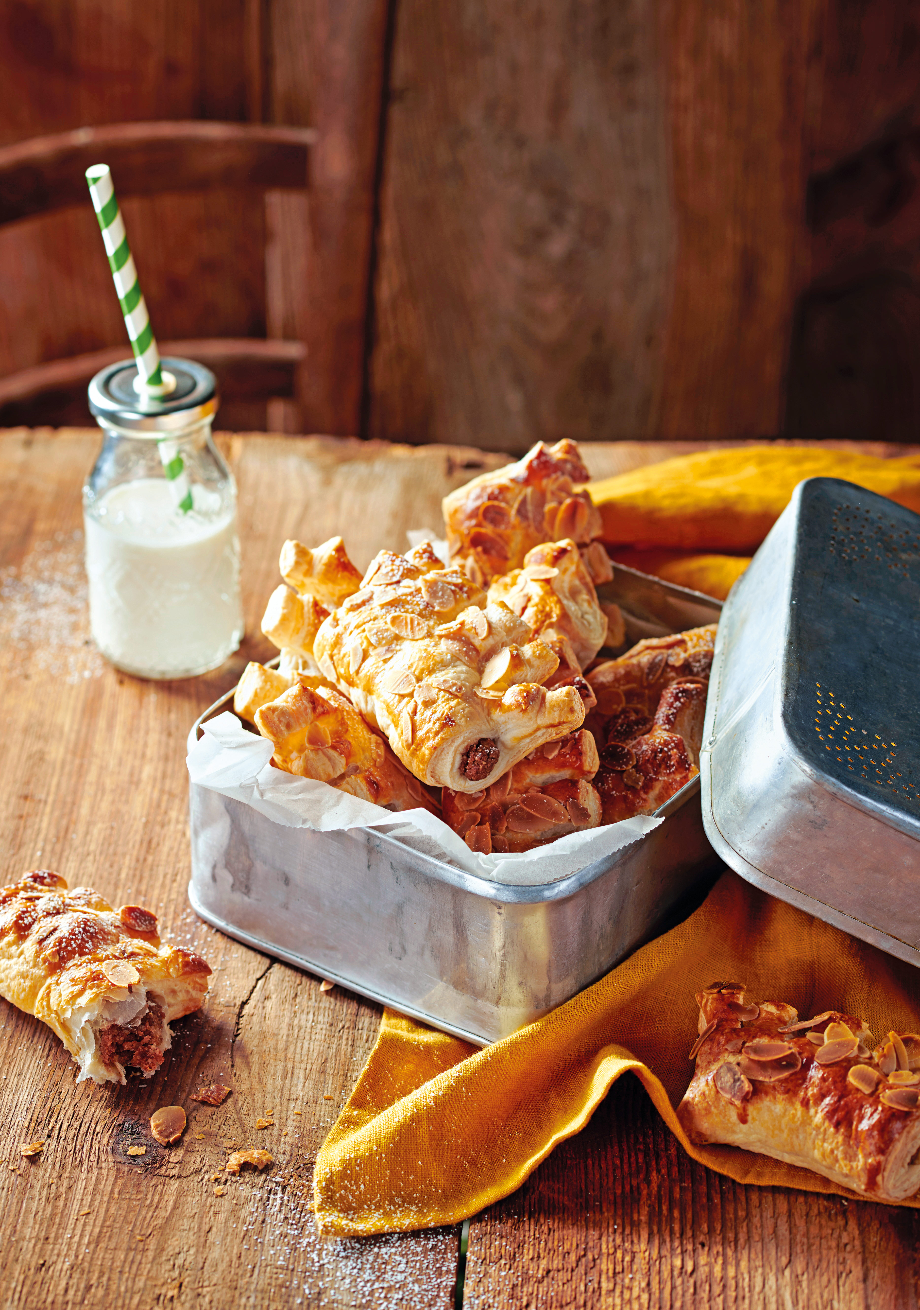 Blätterteig aufrollen und in 8 Rechtecke schneiden. Fülle darauf verteilen. Teig über die Fülle einklappen und leicht andrücken. Überstehenden Teig mit einem Messer 4 Mal einschneiden. Kronen und auf das Blech legen, mit Ei bestreichen und mit Mandelblättchen bestreuen. Im Rohr (mittlere Schiene) ca. 25 Minuten goldbraun backen.