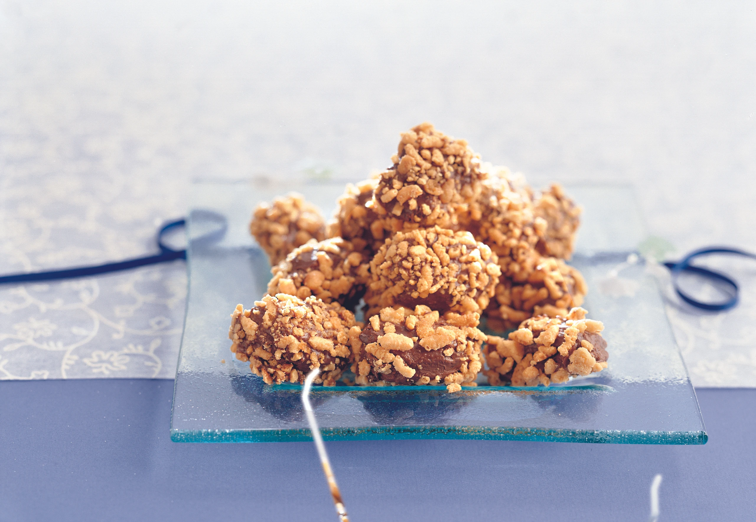 Aus der Nougatmasse mit 2 kleinen Löffeln Nockerl formen und im Marzipanstreusel wälzen. Nockerl kalt stellen.
