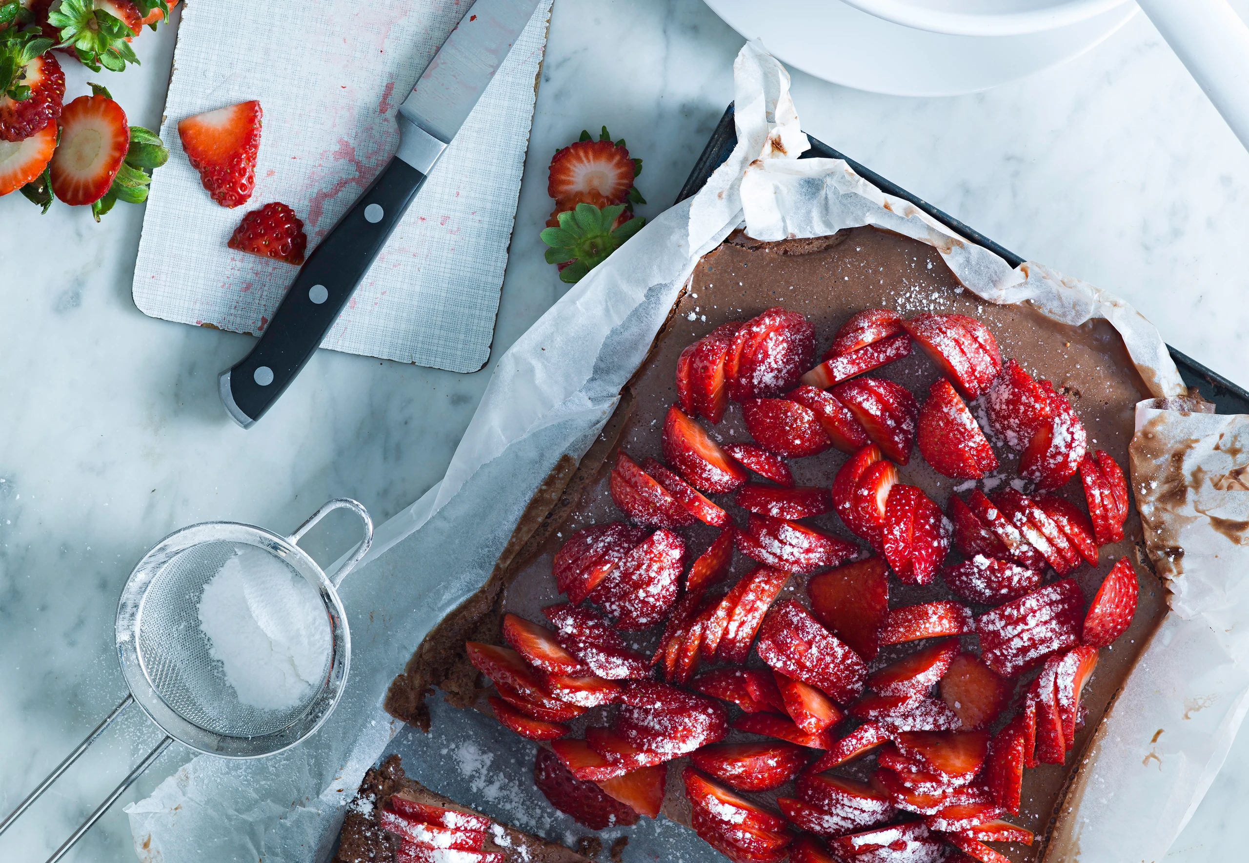 Für die Garnitur Erdbeeren in Scheiben schneiden. Kuchen vom Rahmen losschneiden. Rahmen abheben. Kuchen mit den Erdbeerscheiben garnieren und mit Staubzucker bestreut servieren.