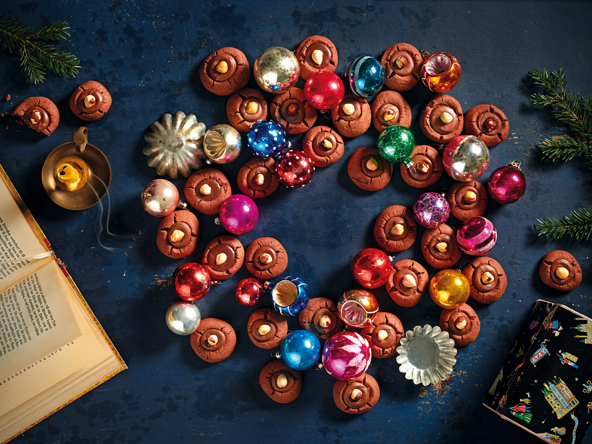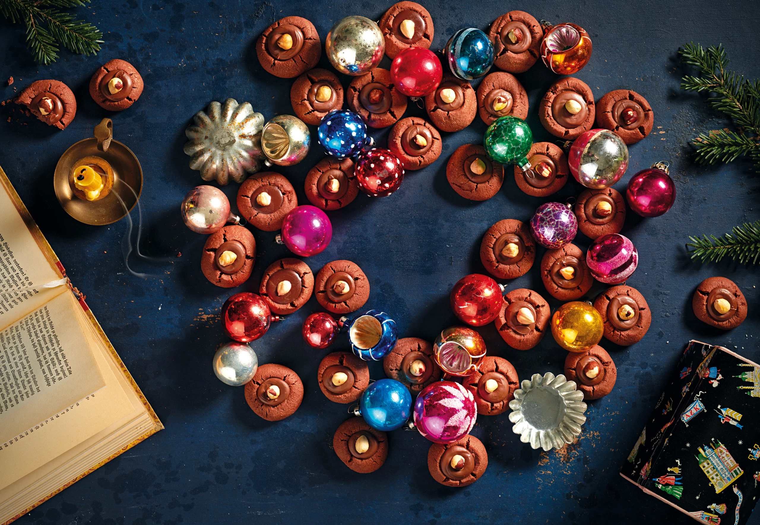 Nougat über einem Wasserbad vorsichtig erwärmen, bis es streichfähig ist. Nougat in einen Dressiersack füllen und die Mulden der Kekse damit füllen. Nougat-Taler mit je einer Haselnuss belegen. Kekse in einer Dose aufbewahren.