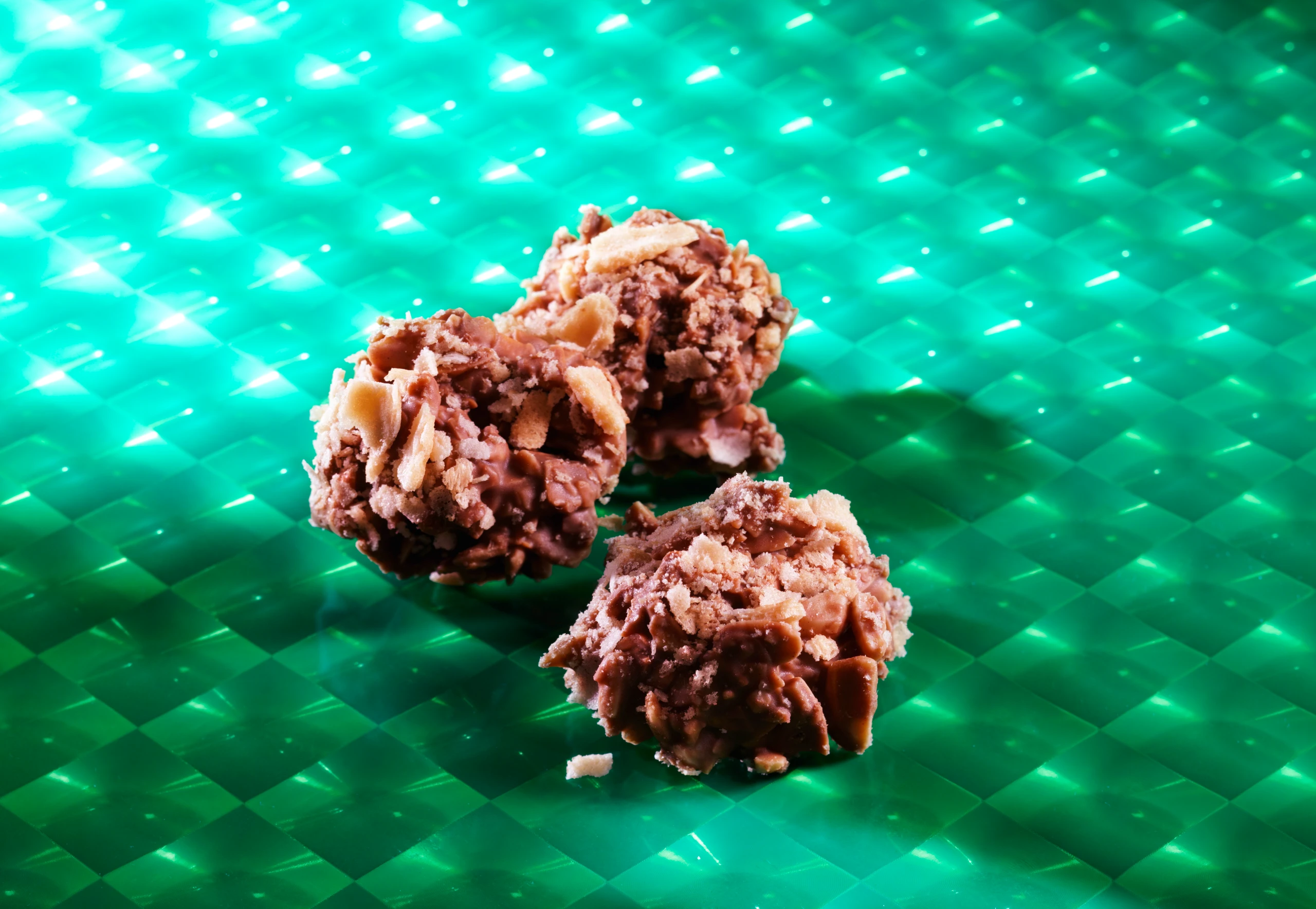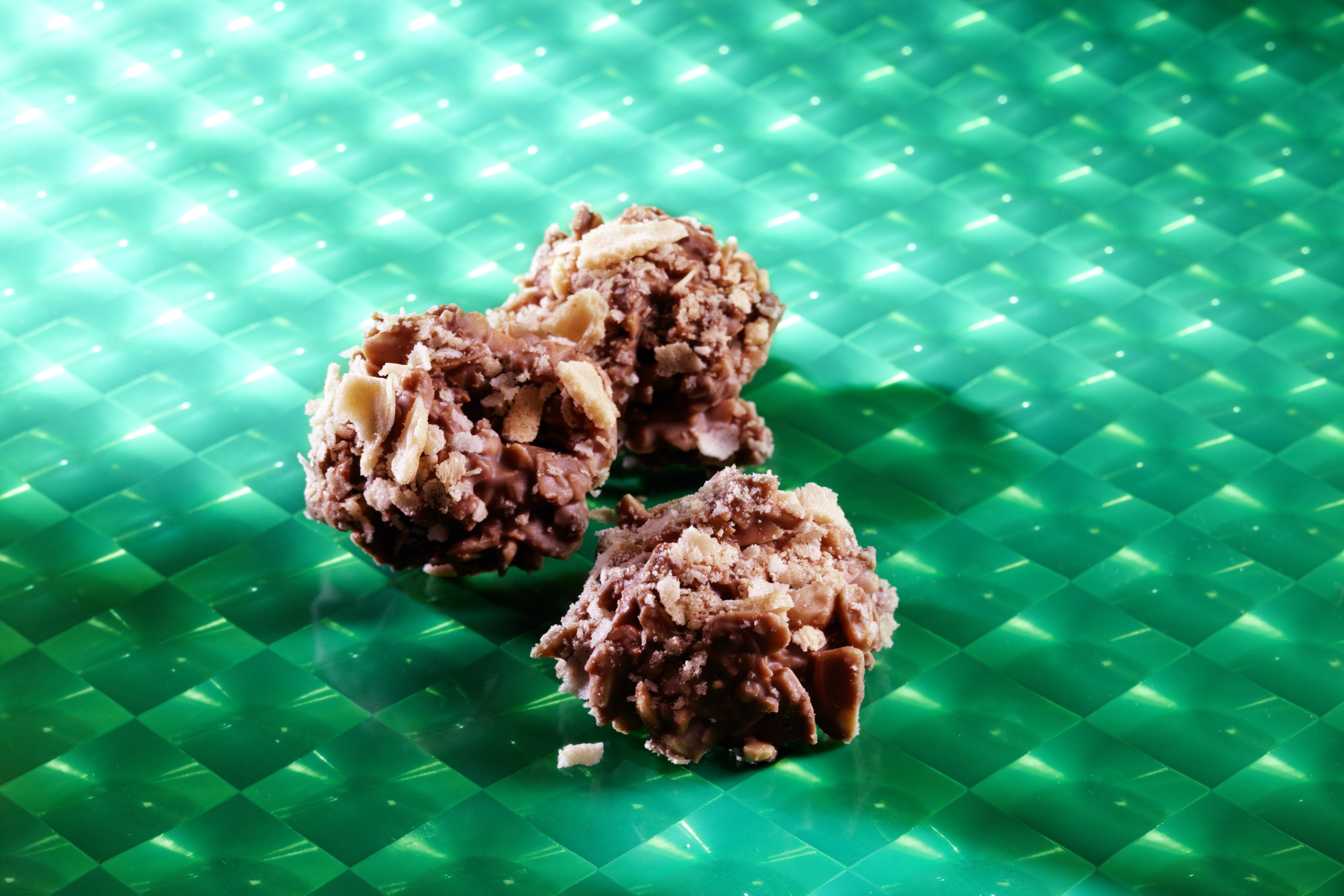 Brett mit Backpapier belegen. Nougat schmelzen und mit den Mandeln vermischen. Mit einem Löffel aus der Mischung Häufchen abstechen und auf das Papier geben.