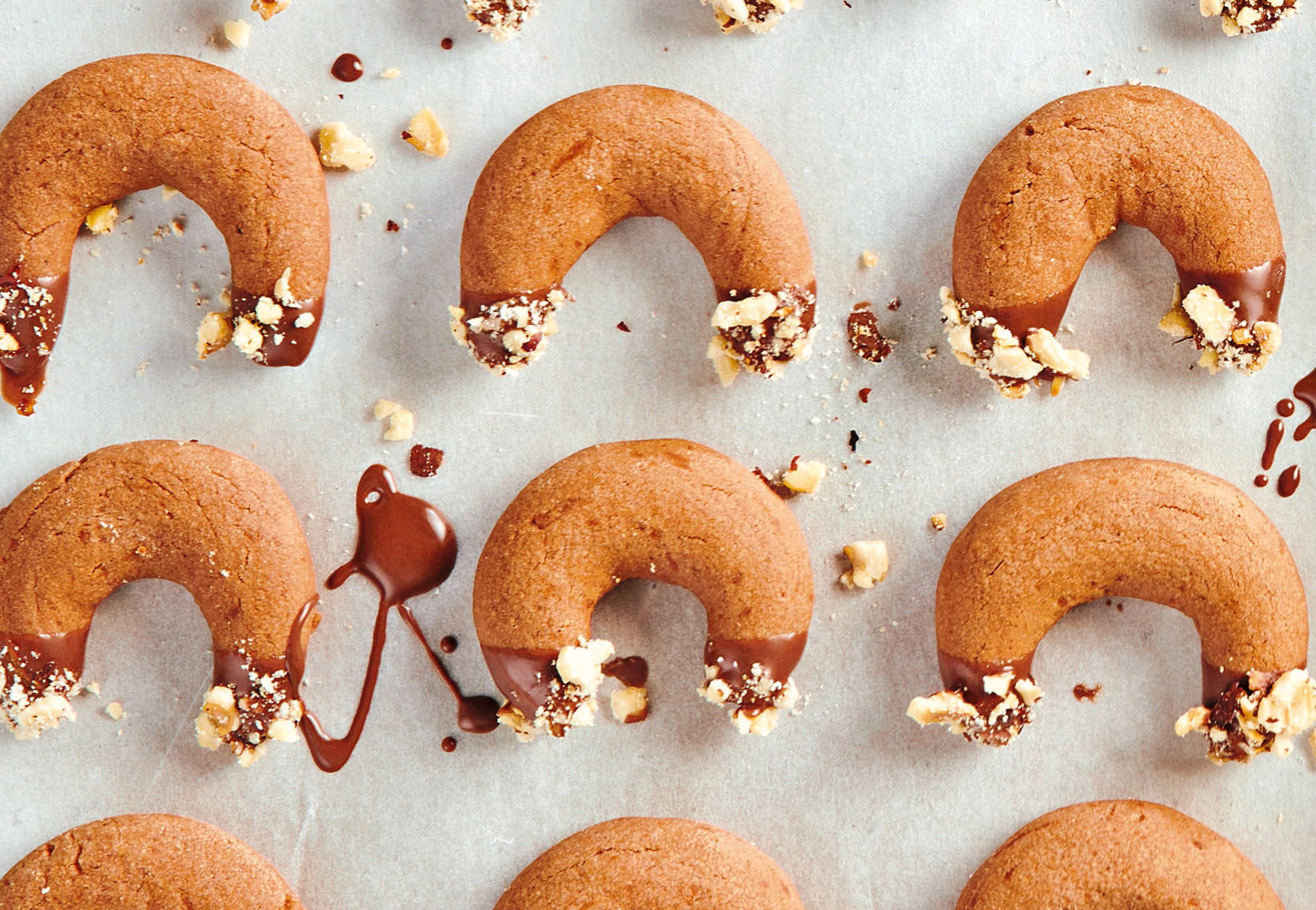 Kipferlenden in die Kuvertüre tunken, gut abtropfen lassen und mit den gehackten Nüssen bestreuen. Auf Backpapier trocknen lassen.
