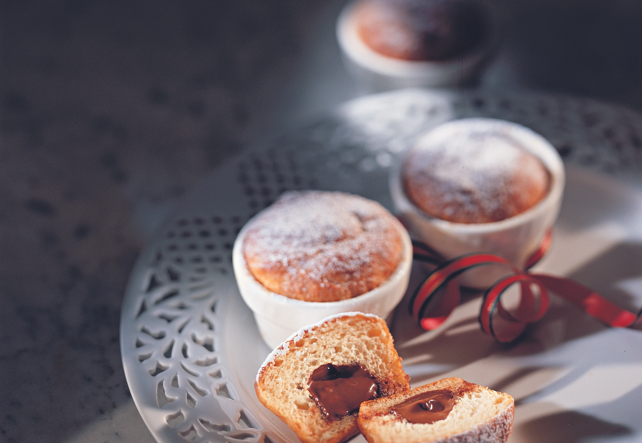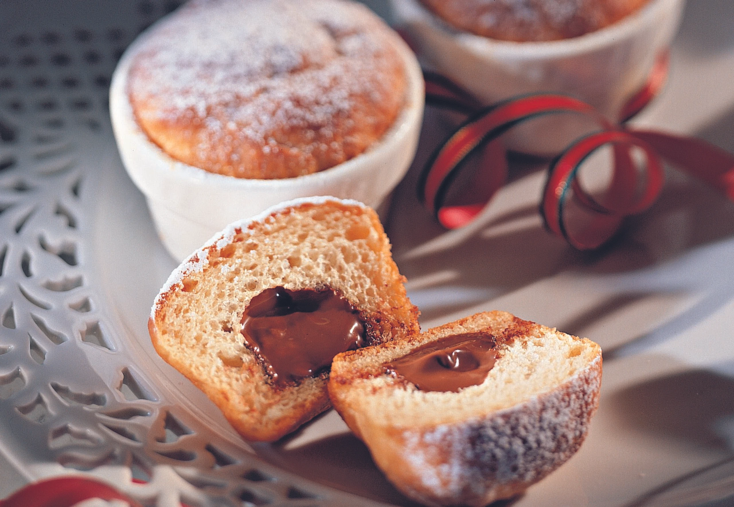 Auf jede Teigscheibe ein Stück Nougat legen. Teig über der Nougatfülle zusammenfassen, festdrücken und mit der Verschlussseite nach unten in die Förmchen setzen. Förmchen mit einem Tuch zudecken, Krapfen bei Zimmertemperatur aufgehen lassen (20– 30 Minuten). Backrohr auf 160 °C vorheizen.