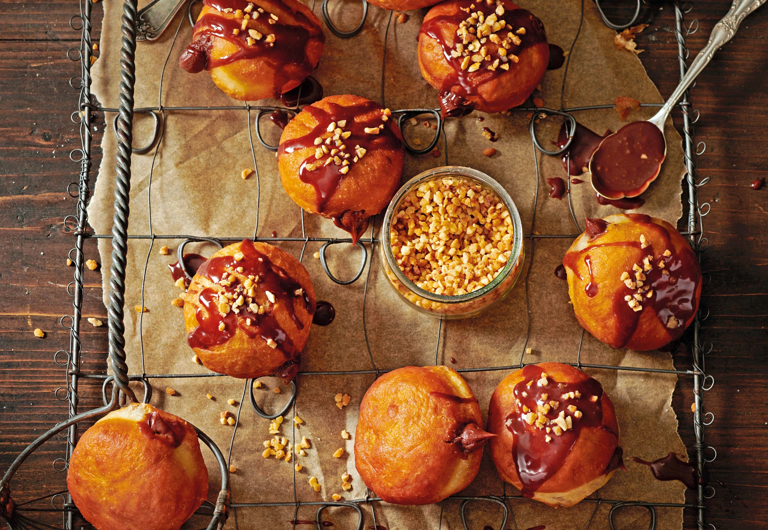 Für die Glasur Nougat klein schneiden. Obers aufkochen, vom Herd nehmen und zum Nougat leeren. 5 Minuten schmelzen lassen und glatt rühren. Kugerl mit der Glasur beträufeln und mit dem Krokant bestreuen.