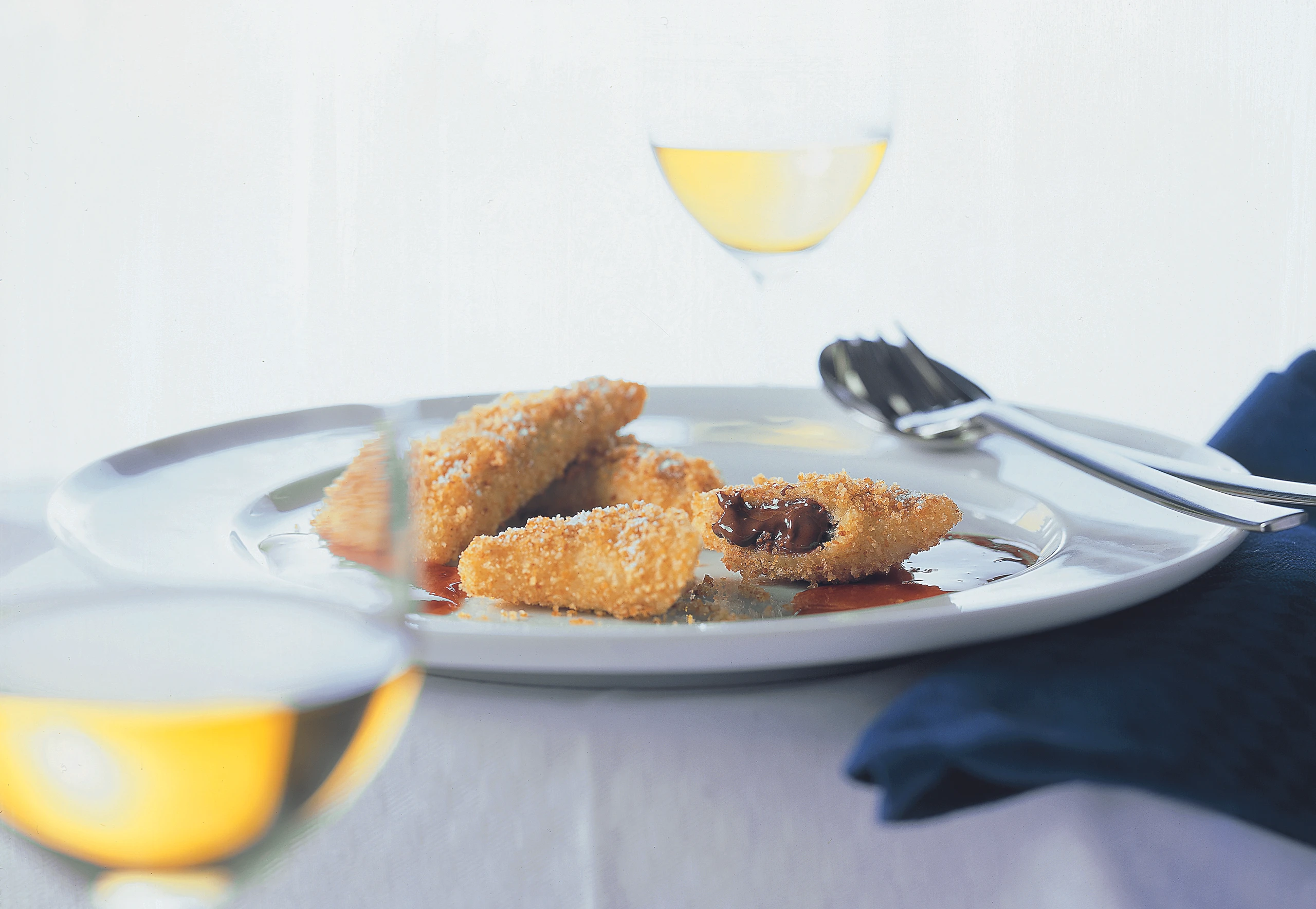 Nougat in 12 Stücke teilen. Teig mit Mehl stauben und ca. 3 mm dick ausrollen. 12 Scheiben (Ø 8 cm) ausstechen. Teigränder dünn mit Wasser bestreichen. Teigscheiben mit je einem Stück Nougat belegen, über die Mitte zusammenklappen und die Ränder festdrücken.
