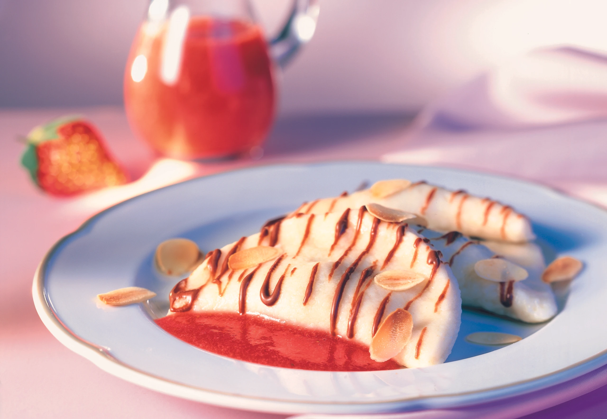 - Nougattascherln mit einem Siebschöpfer aus dem Kochwasser heben, gut abtropfen lassen und mit der Erdbeersauce anrichten. Mit geschmolzenem Nougat und Mandelblättchen garnieren.