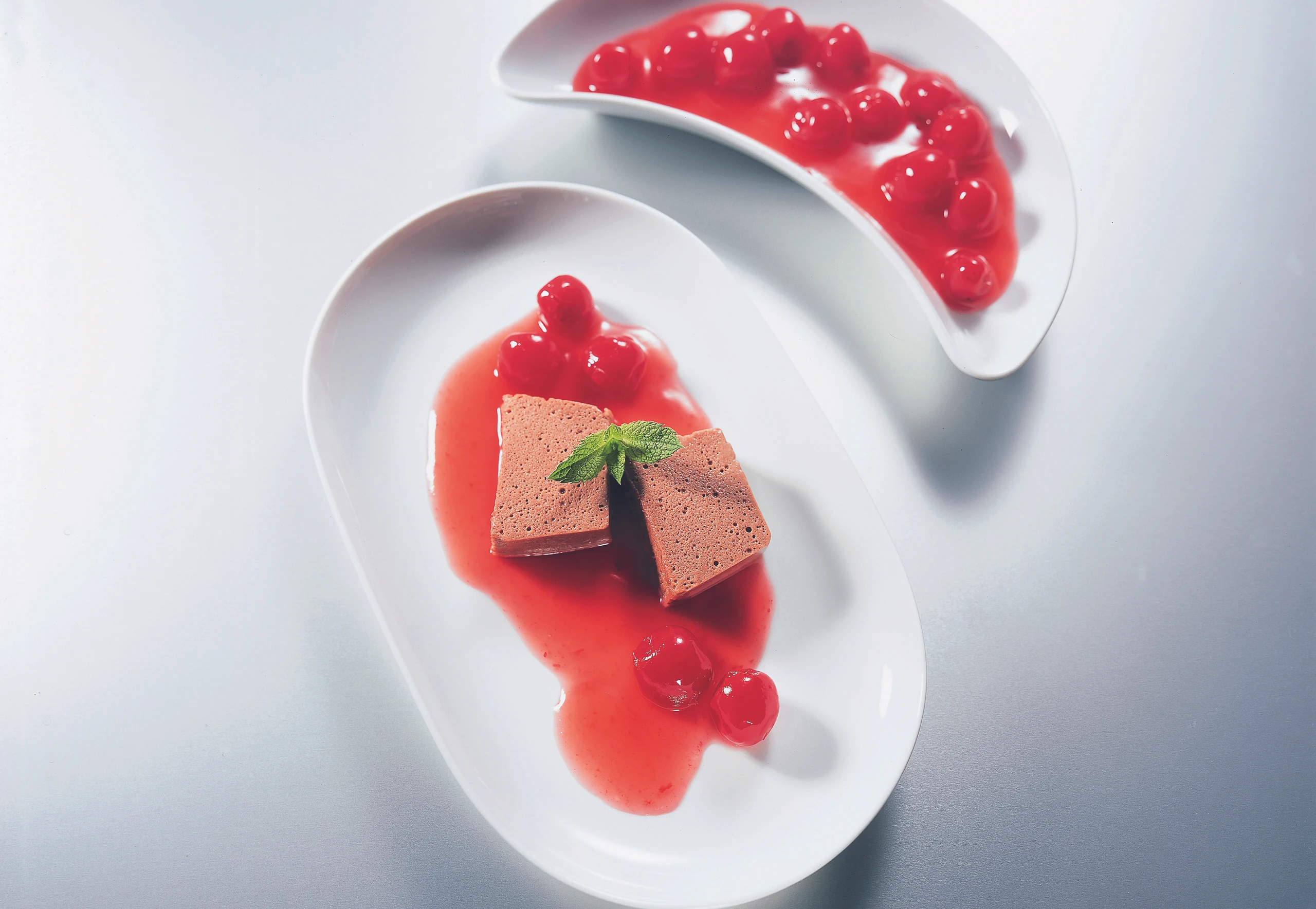 Nougatterrine aus der Form stürzen und die Folie entfernen. Terrine in Scheiben schneiden und mit den eingemachten Kirschen und Minze garniert servieren.