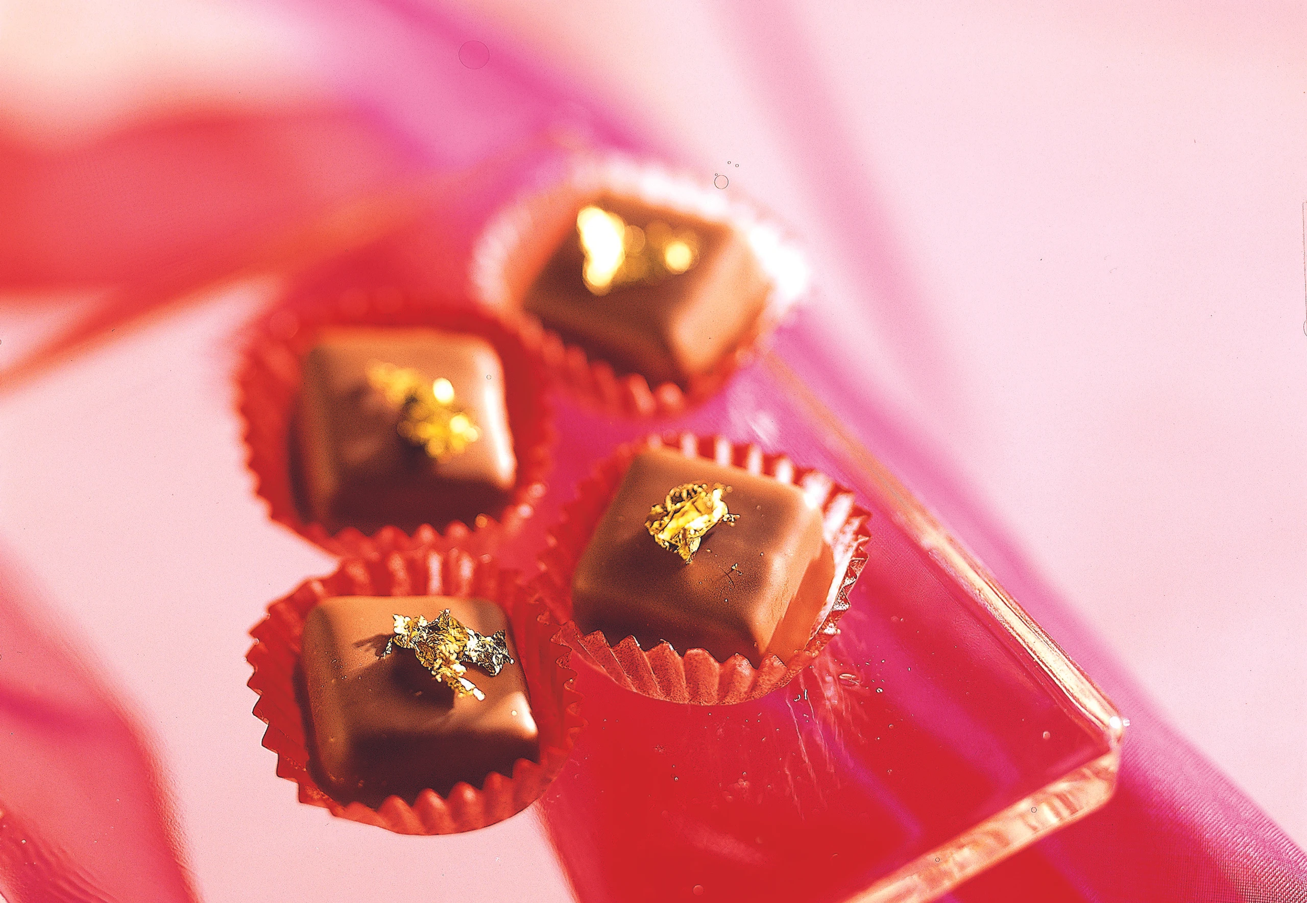 Konfekt mit Blattgold oder einer geschälten, gerösteten Haselnuss dekorieren.