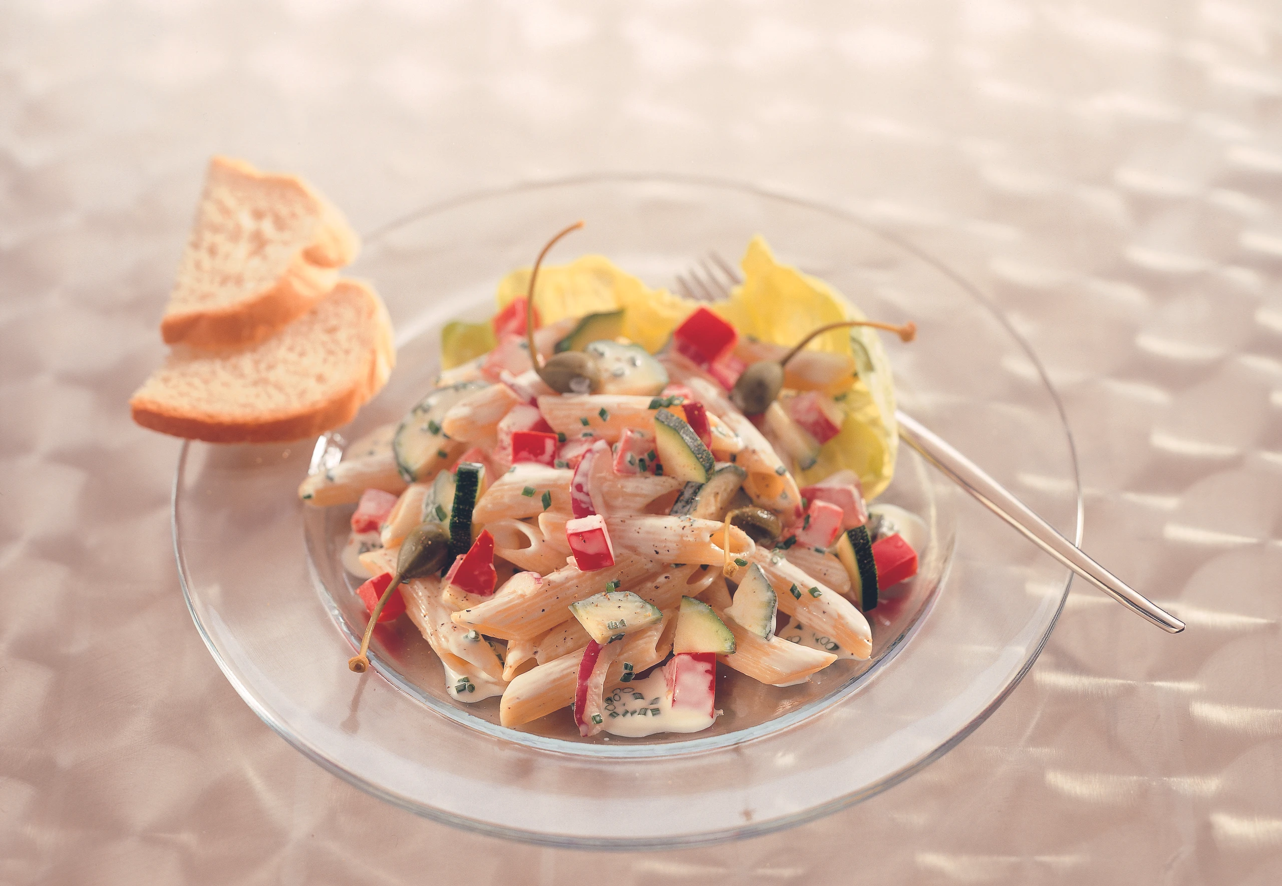 Für die Marinade Schnittlauch fein schneiden. Mayonnaise oder QimiQ mit Joghurt und Schnittlauch verrühren und mit Salz, Pfeffer, Senf und Zitronensaft würzen. Nudeln und Gemüse mit der Marinade vermischen. Nudelsalat anrichten und mit Kapernbeeren garnieren. Zum Salat passt Weißbrot.