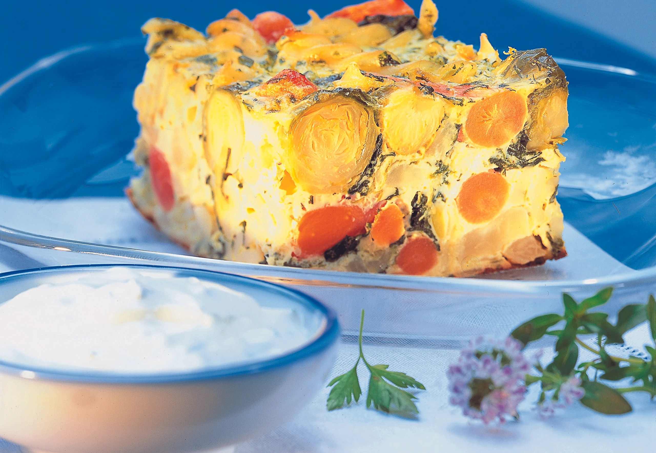 - Für den Guss Sauerrahm mit Schlagobers, Eiern, Dotter, Kräutermischung, Salz und Pfeffer gut verschlagen.