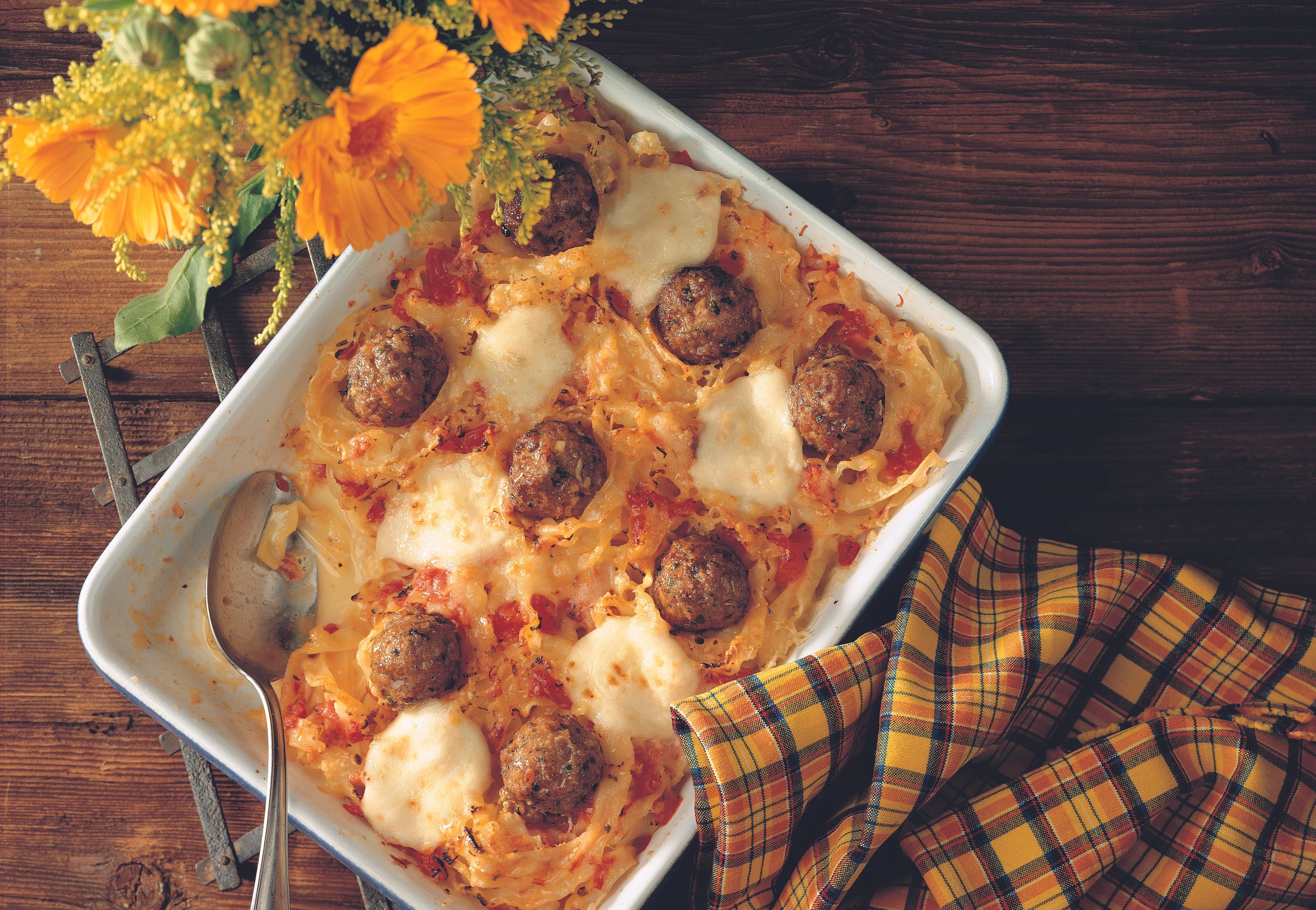 Eine Auflaufform dünn mit Butter ausstreichen. Nudeln zu Nestern formen und in die Form setzen. Paradeissauce über den Nudeln verteilen. Fleischbällchen in die Nudelnester setzen und mit Emmentaler bestreuen.