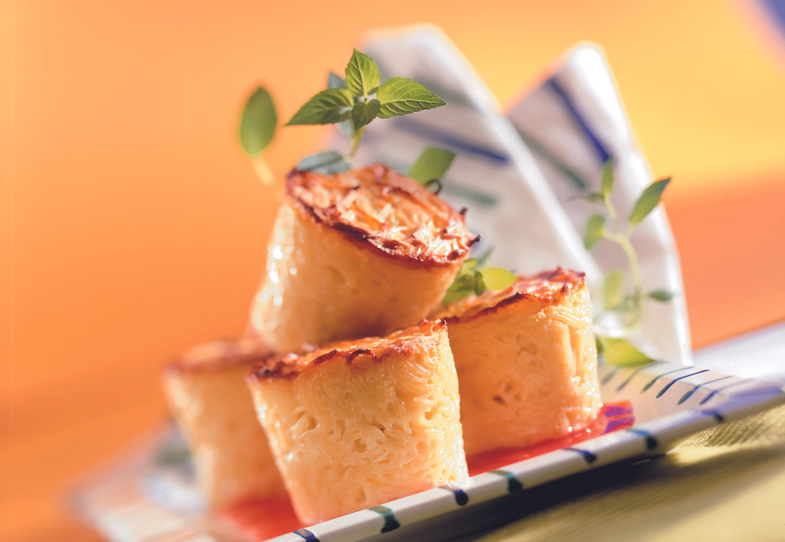 Nudeln in Salzwasser bissfest kochen, abseihen, abschrecken und abtropfen lassen. Auflaufförmchen (Inhalt 150 ml) mit Butter ausstreichen und mit Zucker ausstreuen.
