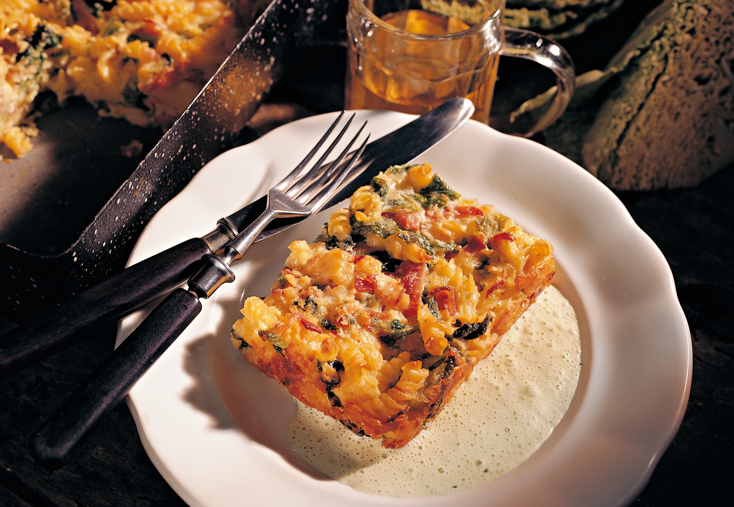 Nudelauflauf im vorgeheizten Rohr (mittlere Schiene / Gitterrost) ca. 3/4 Stunden backen. Als Beilage serviert man am besten eine Kräutersauce und Blattsalate.
